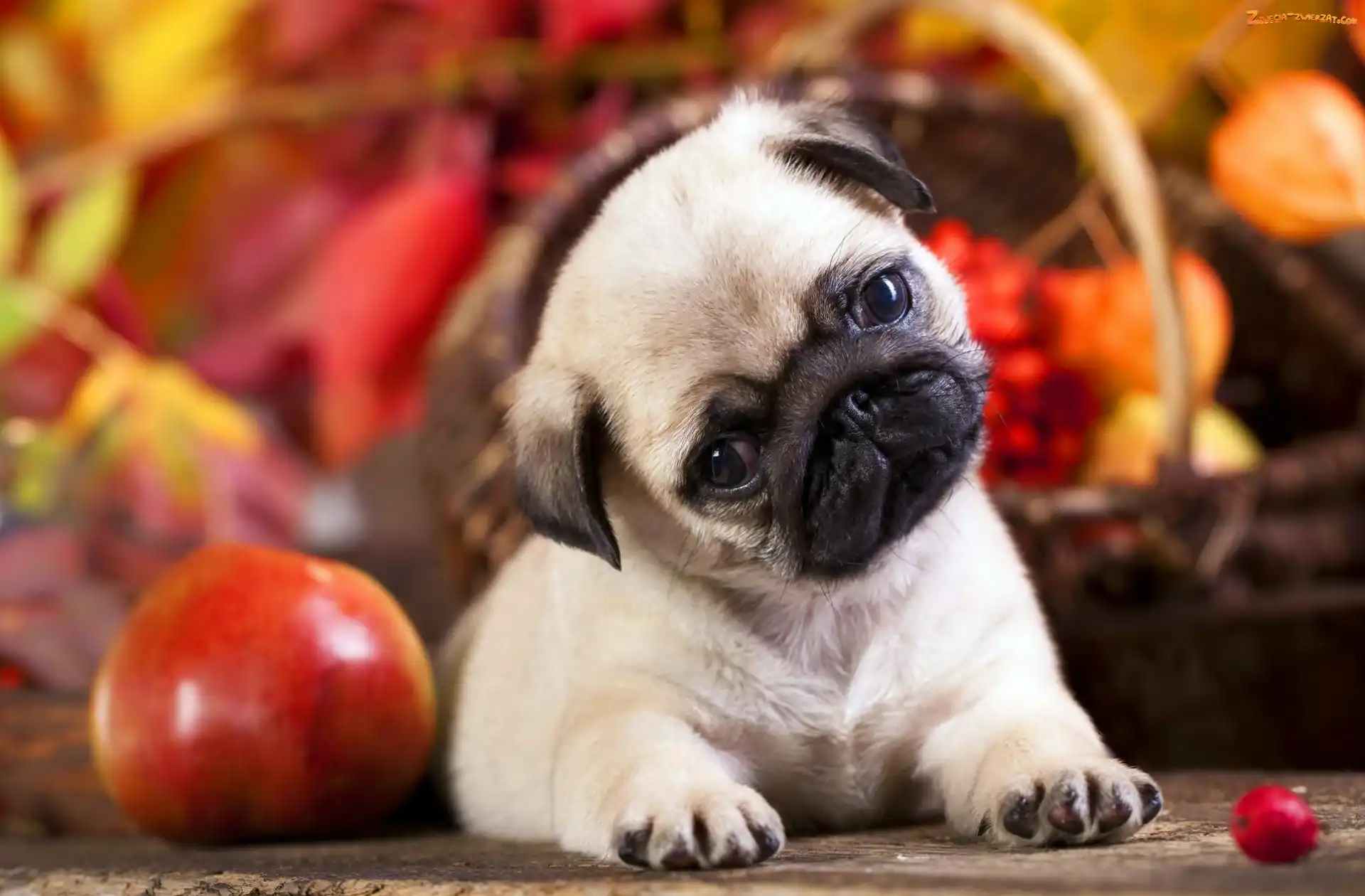 Mops, Słodki, Jesień, Ławka, Szczeniaczek, Jabłko