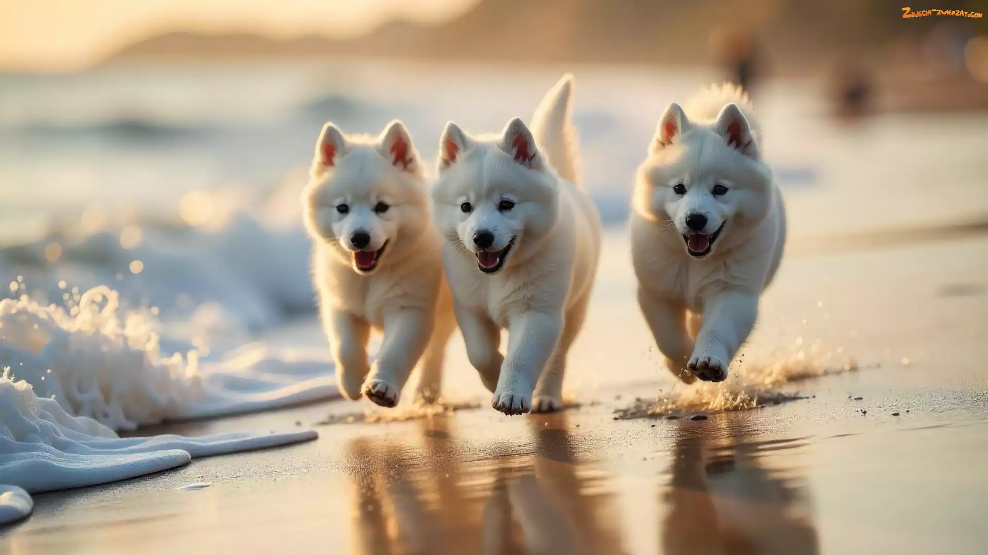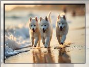 Zdjęcie: Plaża, Trzy, Białe, Szczeniaki, Grafika AI, Psy, Morze