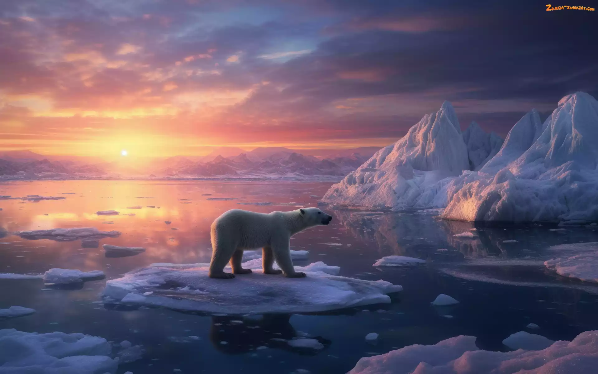 Zdjęcie: Morze, Kra, Zachód słońca, Biały, Zima, Niedźwiedź polarny, Lodowe, Góry