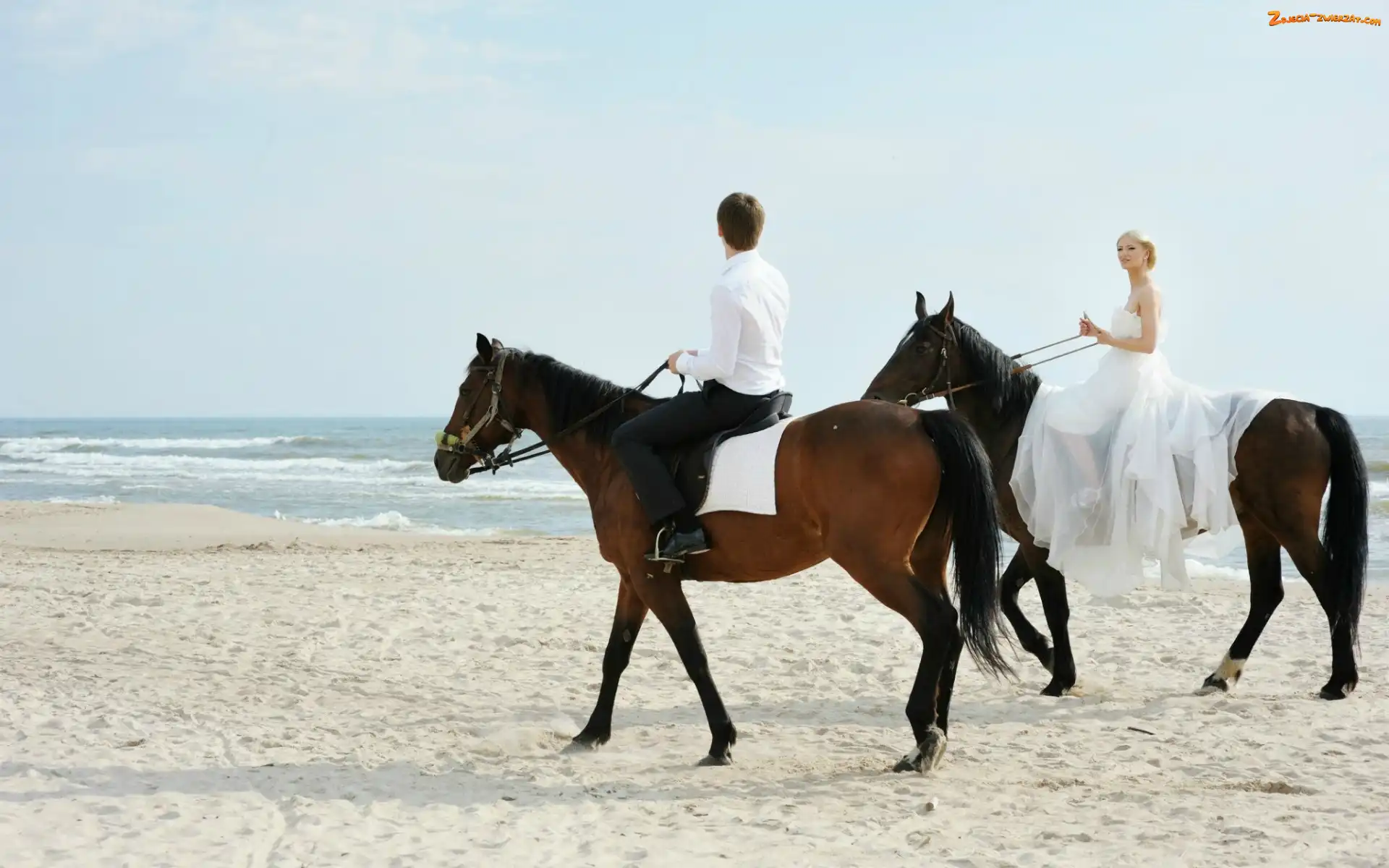 Zdjęcie: Morze, Plaża, Para, Młoda, Konie