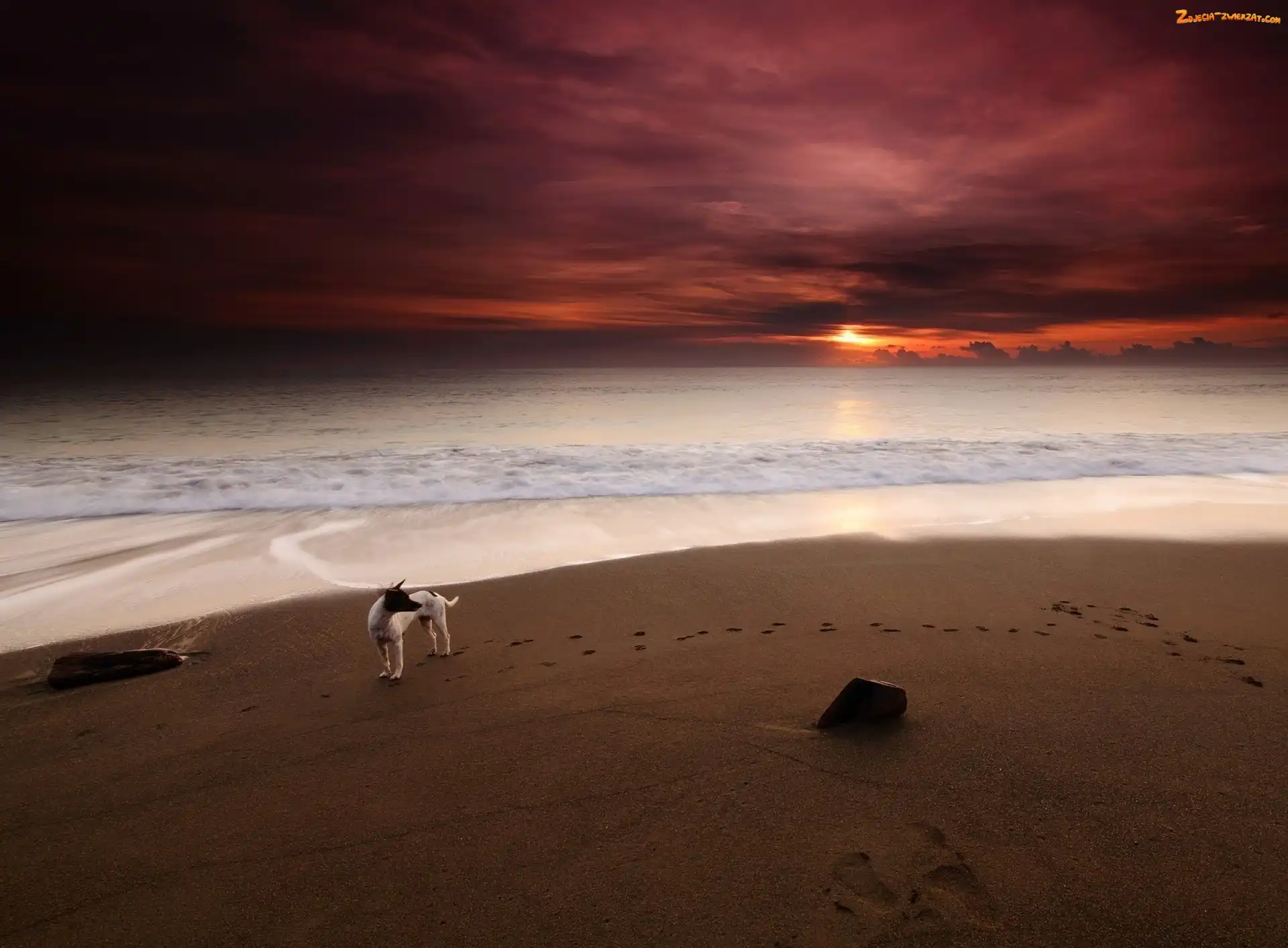 Piasek, Morze, Ślady, Piesek, Plaża, Zachód Słońca