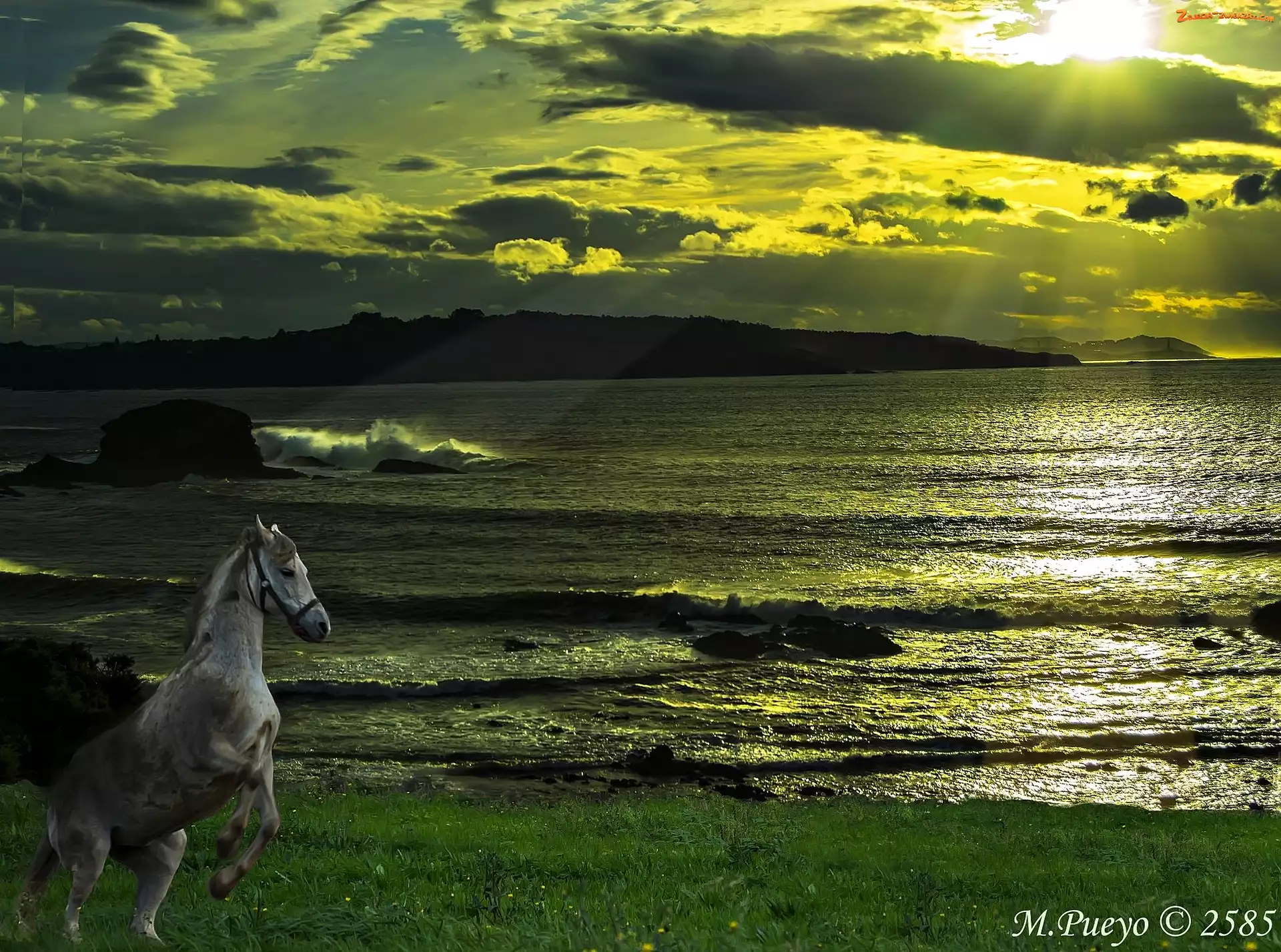 Morze, Łąka, Wschód Słońca, Koń