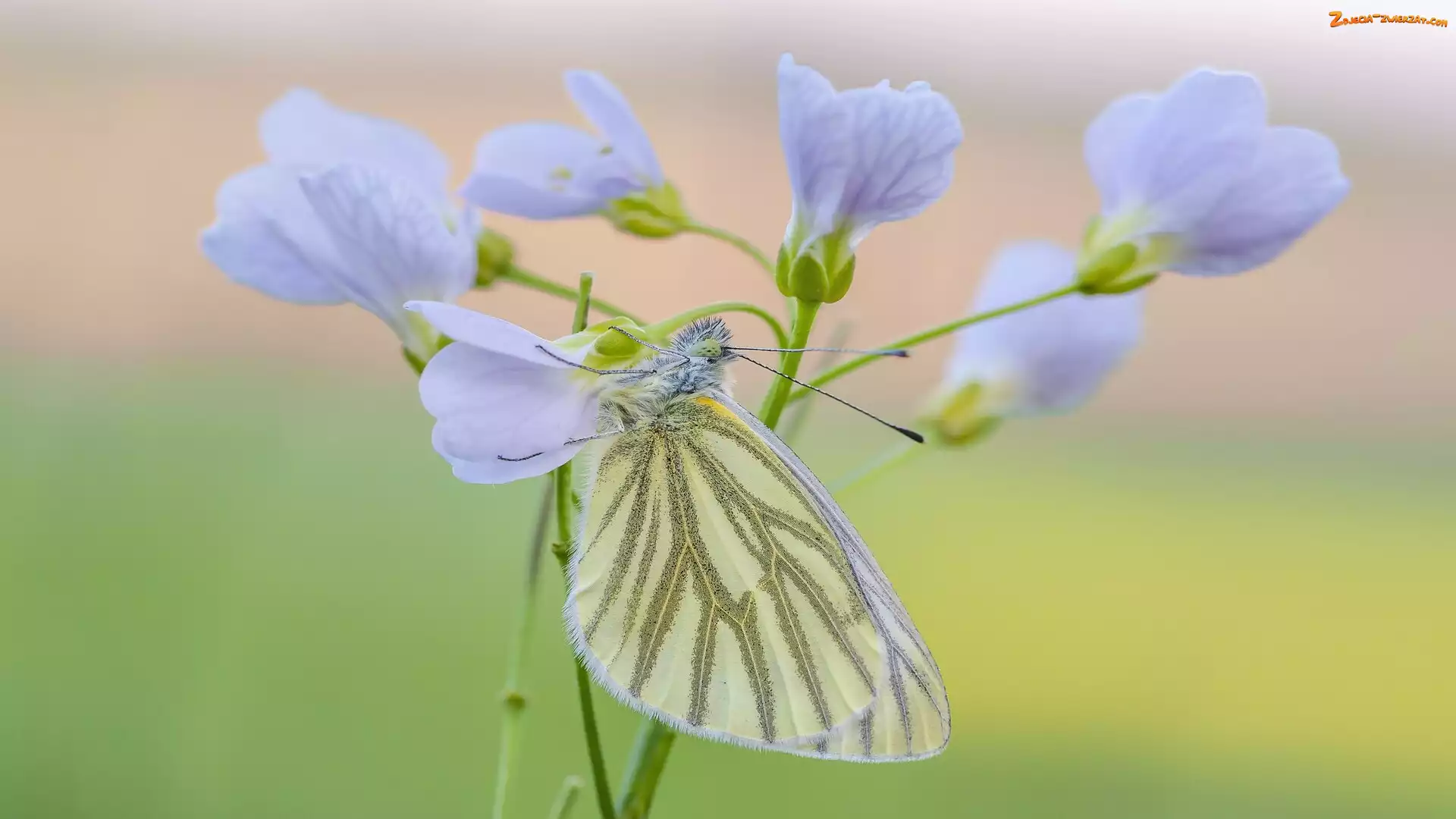 Gałązka, Zbliżenie, Kwiaty, Motyl, Bielinek bytomkowiec
