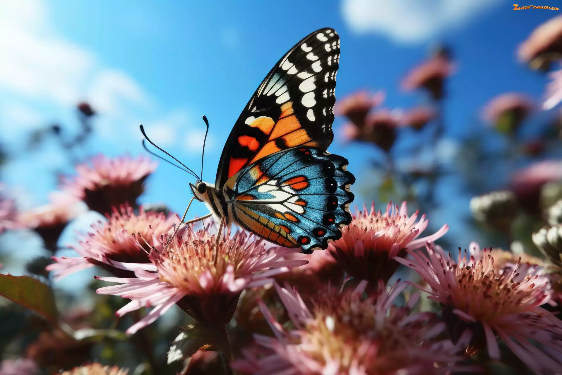 Zdjęcie: Grafika, Różowe, Kolorowy, Motyl, Kwiaty, Niebo