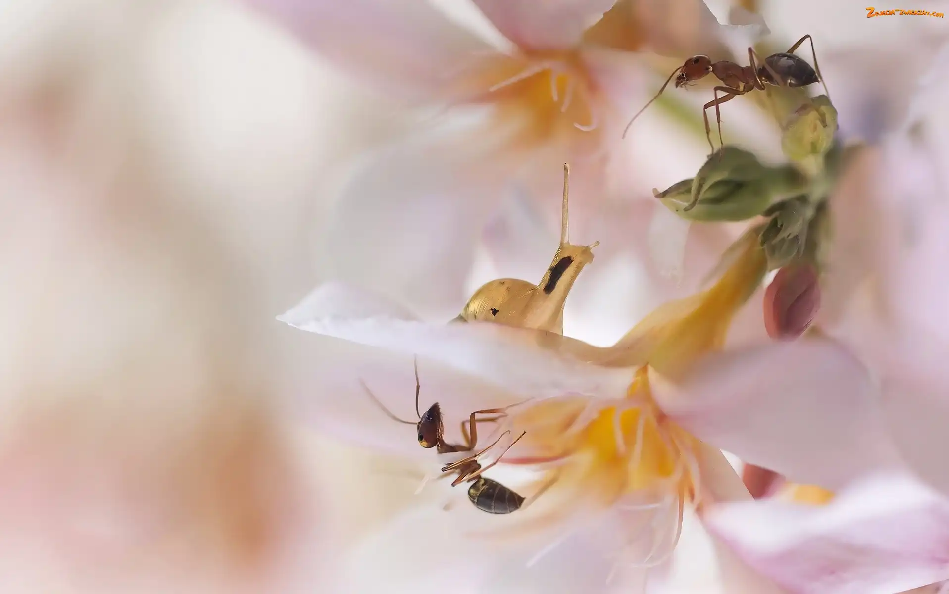 Zdjęcie: Mrówki, Zbliżenie, Kwiaty, Ślimak