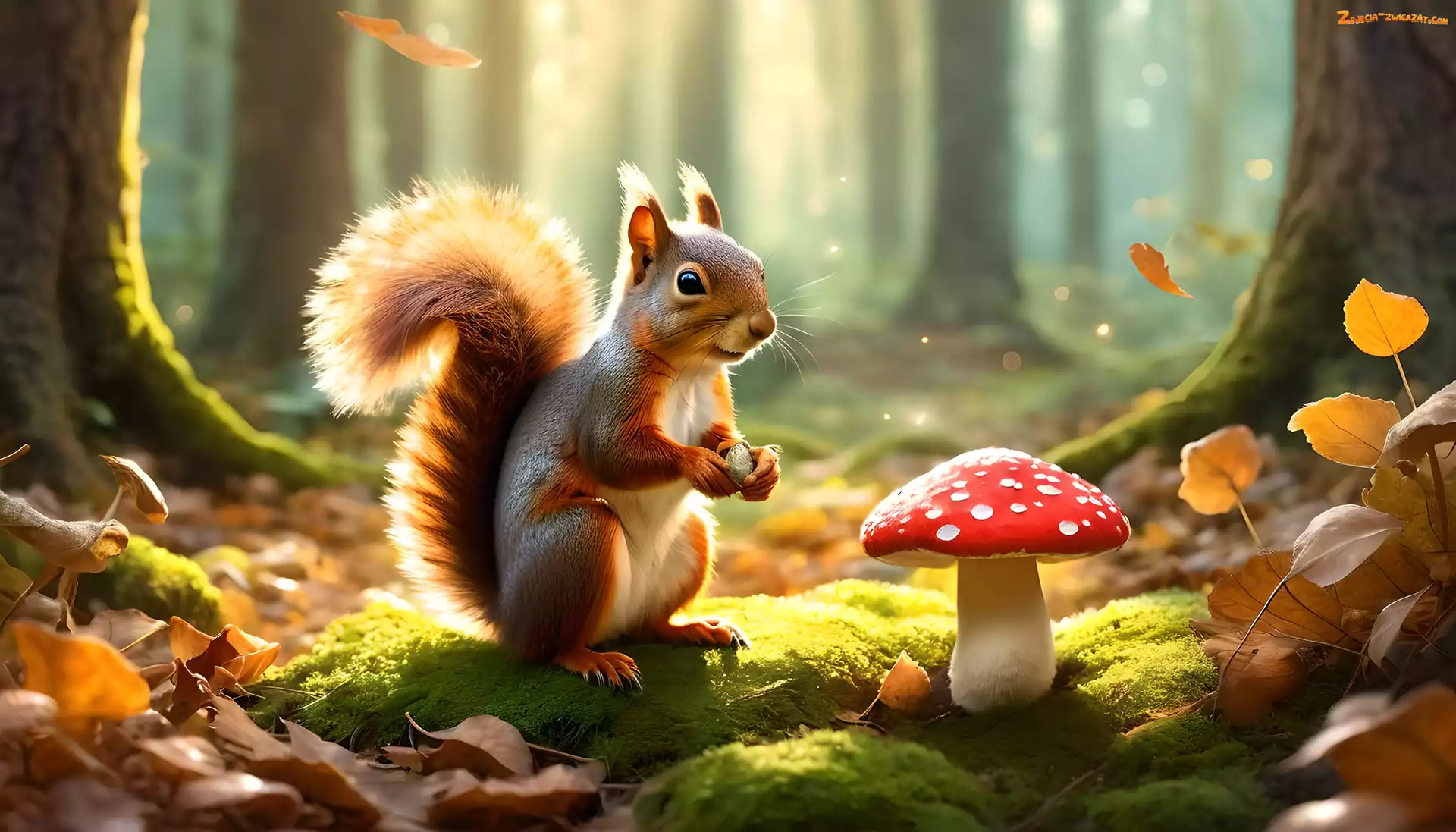 Zdjęcie: Grafika, Grzyb, Wiewiórka, Muchomor, Liście, Mech