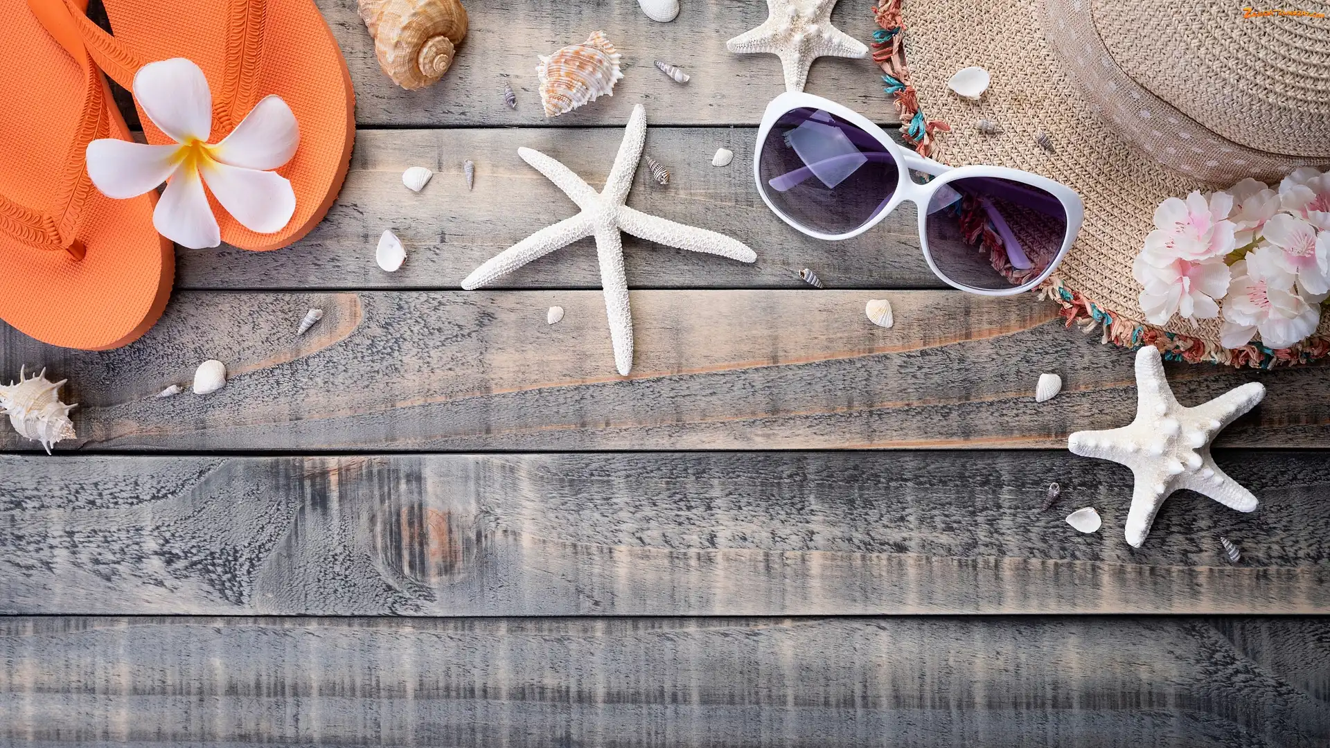 Deski, Muszelki, Klapki, Rozgwiazda, Kapelusz, Plumeria, Kwiat, Okulary
