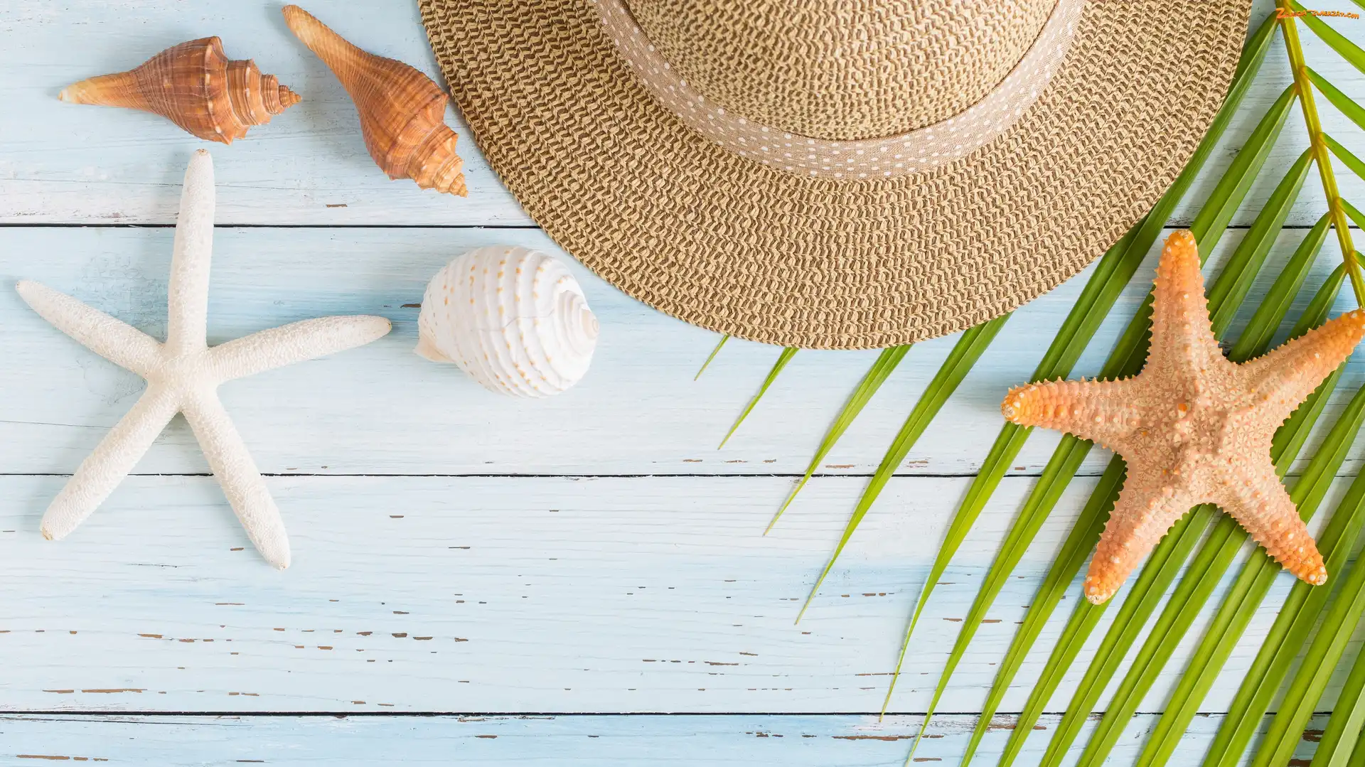 Zdjęcie: Muszelki, Kapelusz, Deski, Palmy, Rozgwiazdy, Liść