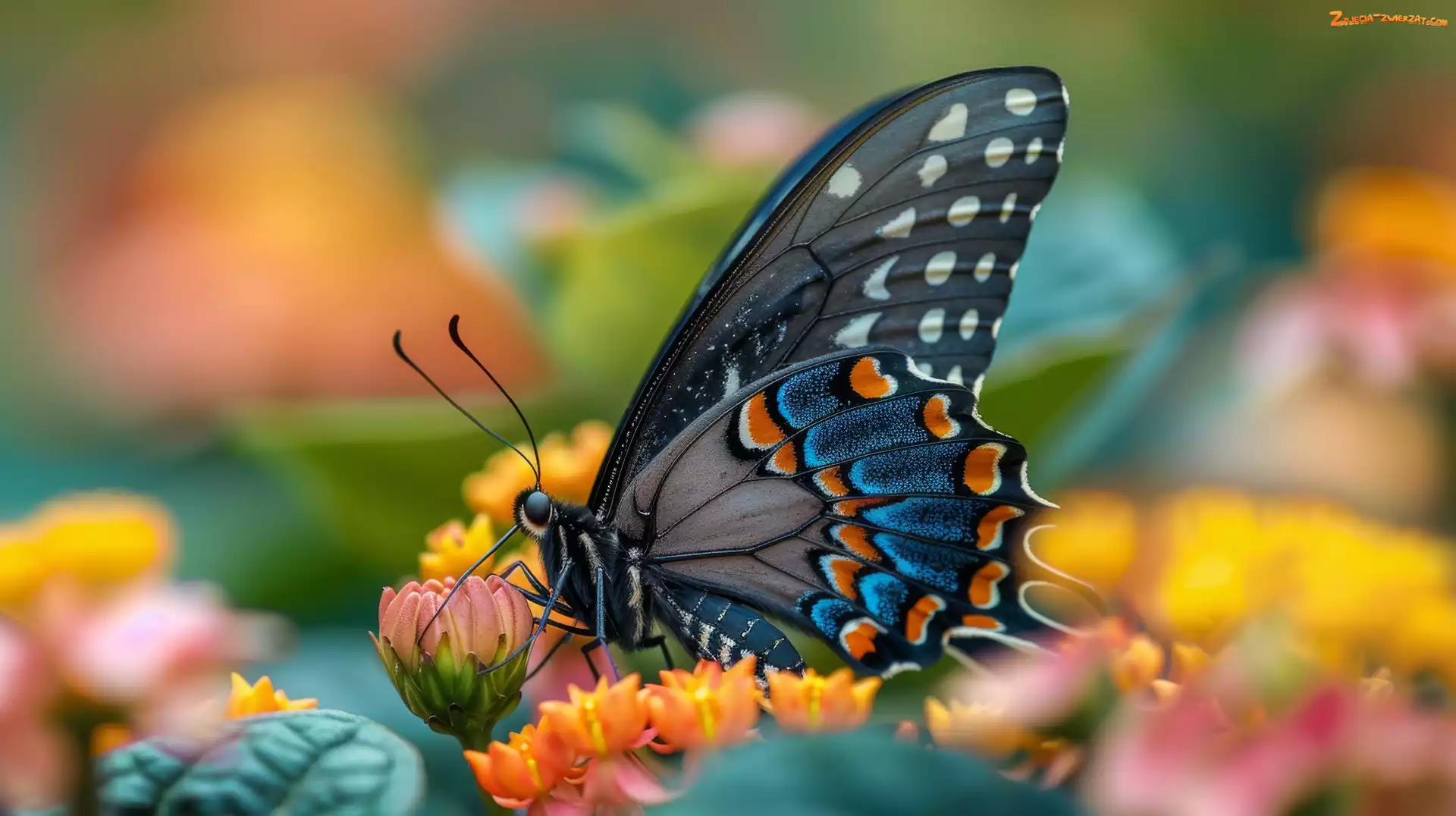 Zdjęcie: Czarno-niebieski, Motyl, Grafika, Kwiaty
