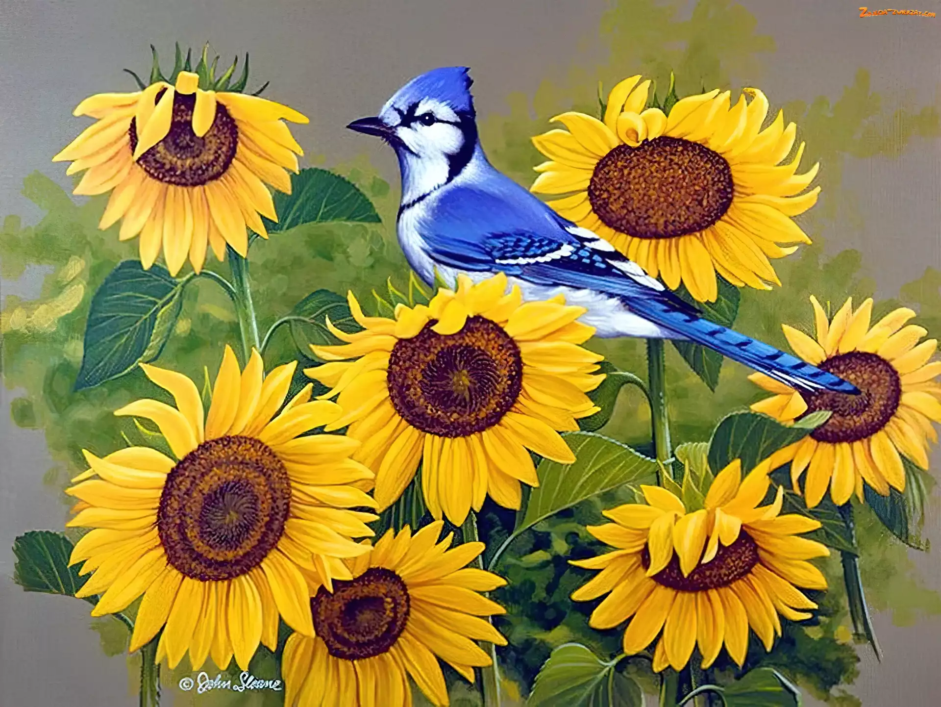 Zdjęcie: Niebiesko, Ptak, Słoneczniki, Biały