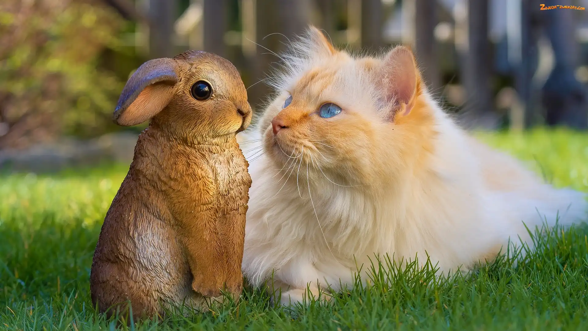 Zdjęcie: Trawa, Niebieskooki, Zapatrzony, Figurka, Zajączek, Rudy, Kot