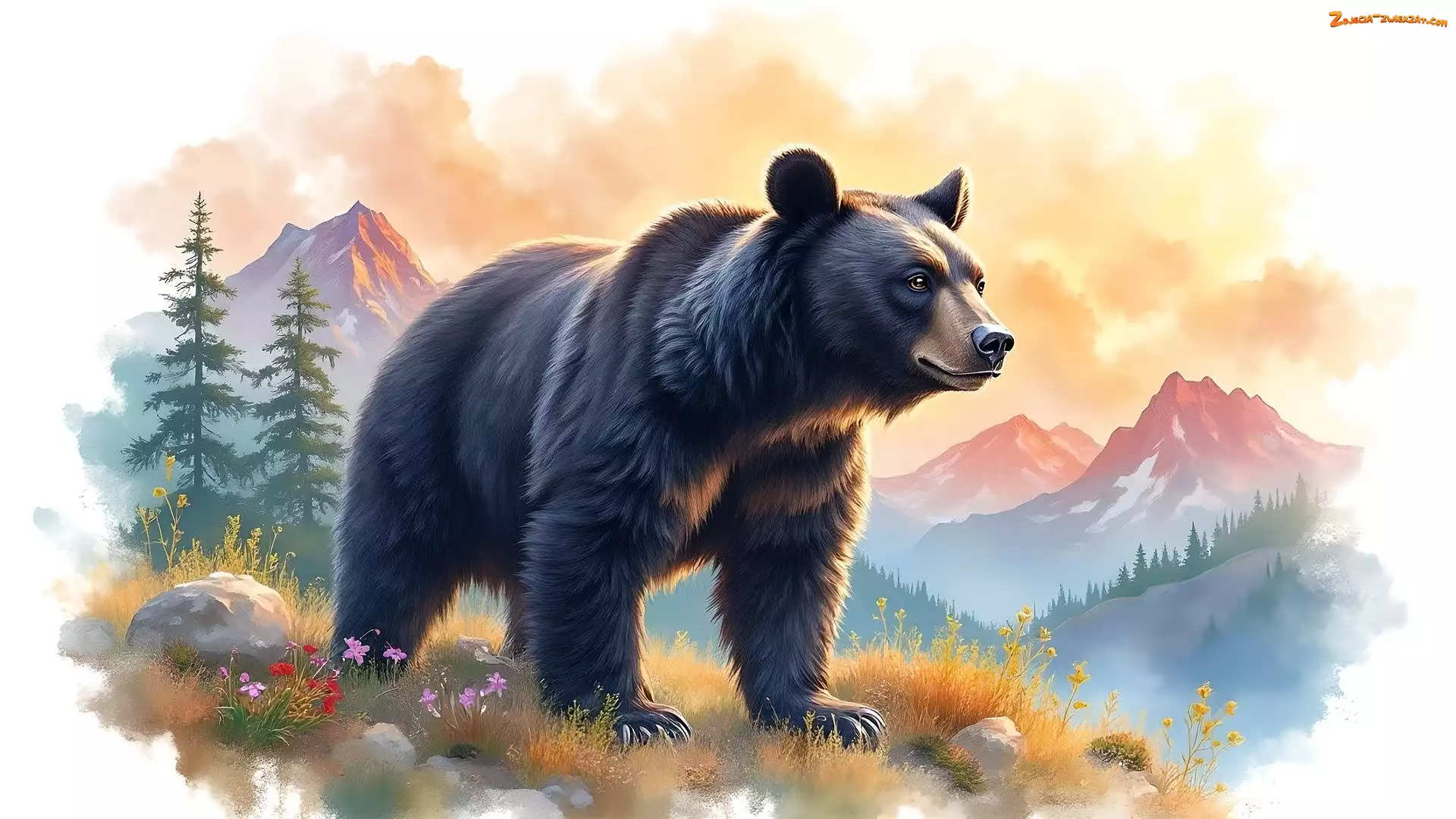 Zdjęcie: Kwiaty, Czarny, Grafika, Niedźwiedź, Góry, Drzewa