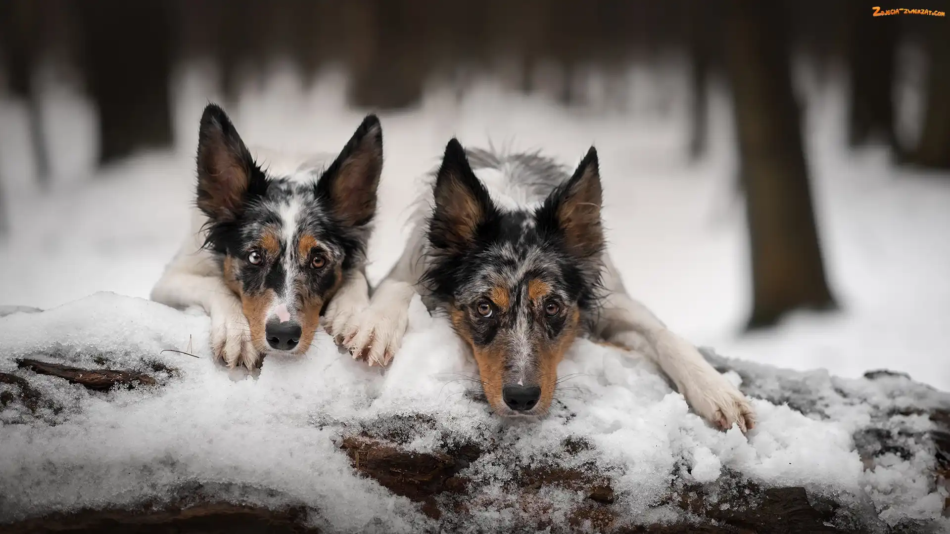 Zdjęcie: Śnieg, Drzewo, Psy, Dwa, Border collie