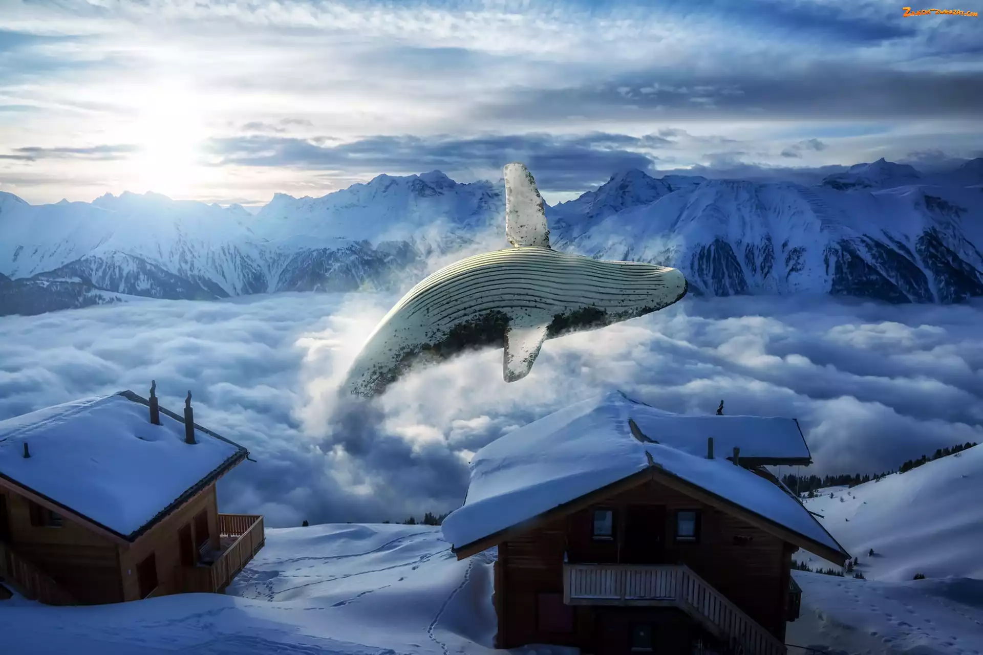 Zdjęcie: Fantasy, Śnieg, Góry, Zima, Wieloryb, Domy, Chaty, Chmury