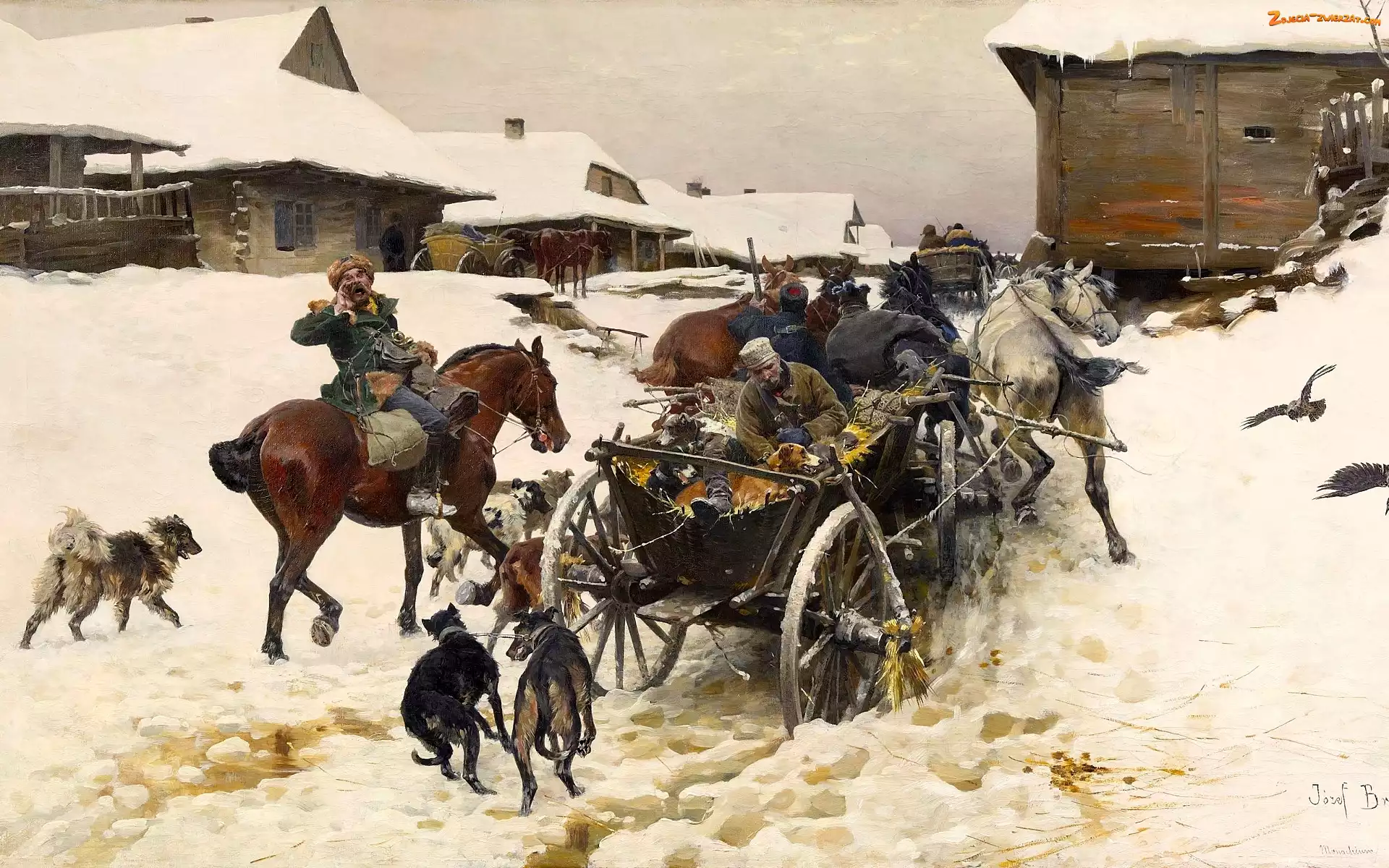 Zdjęcie: Zima, Domy, Śnieg, Malarstwo, Psy, Konie, Józef Brandt, Obraz, Zaprzęg konny