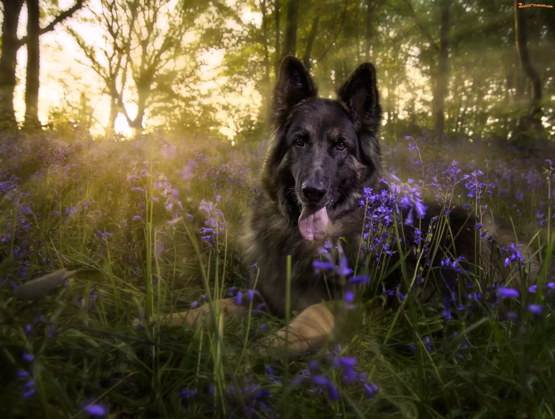 Zdjęcie: Słońca, Niemiecki, Pies, Kwiatki, Promienie, Owczarek, Las