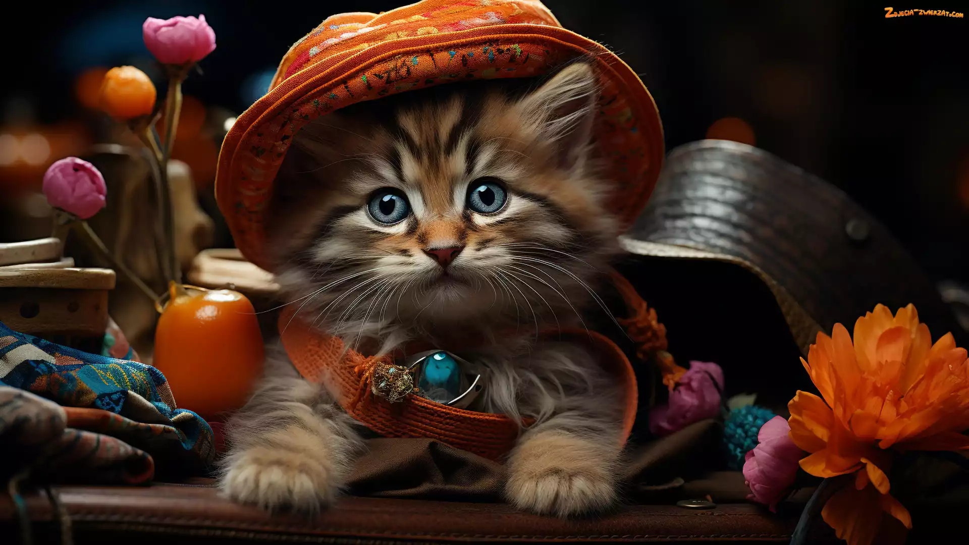 Zdjęcie: Kotek, Kapelusz, Kwiaty, Obroża