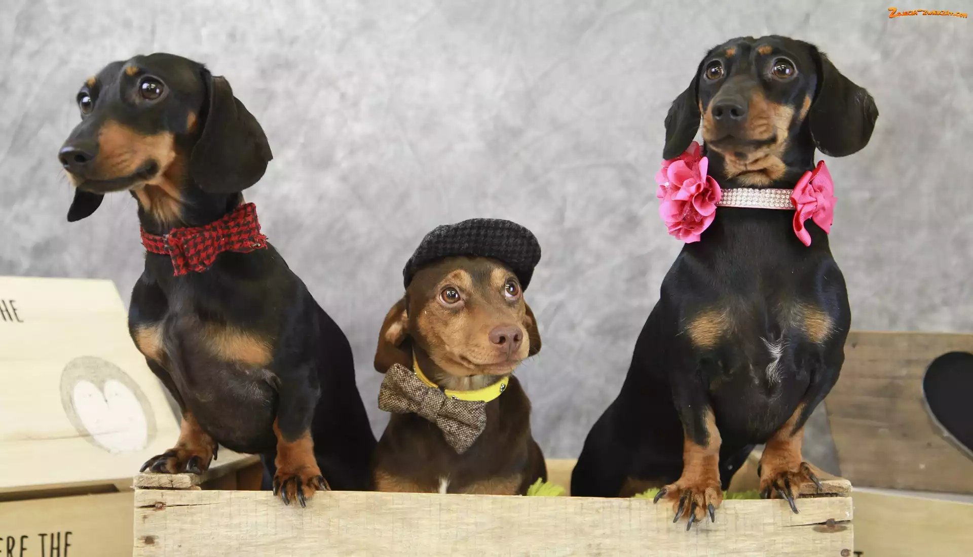 Zdjęcie: Pudło, Obroża, Trzy, Czapka, Drewniane, Jamniki krótkowłose, Muszki