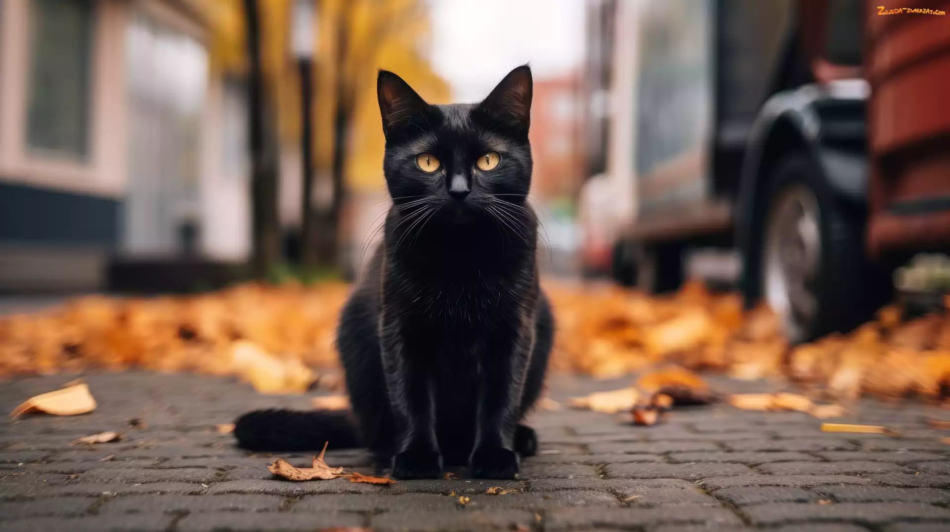 Zdjęcie: Chodnik, Czarny, Kot, Oczy, Ulica, Żółte, Liście