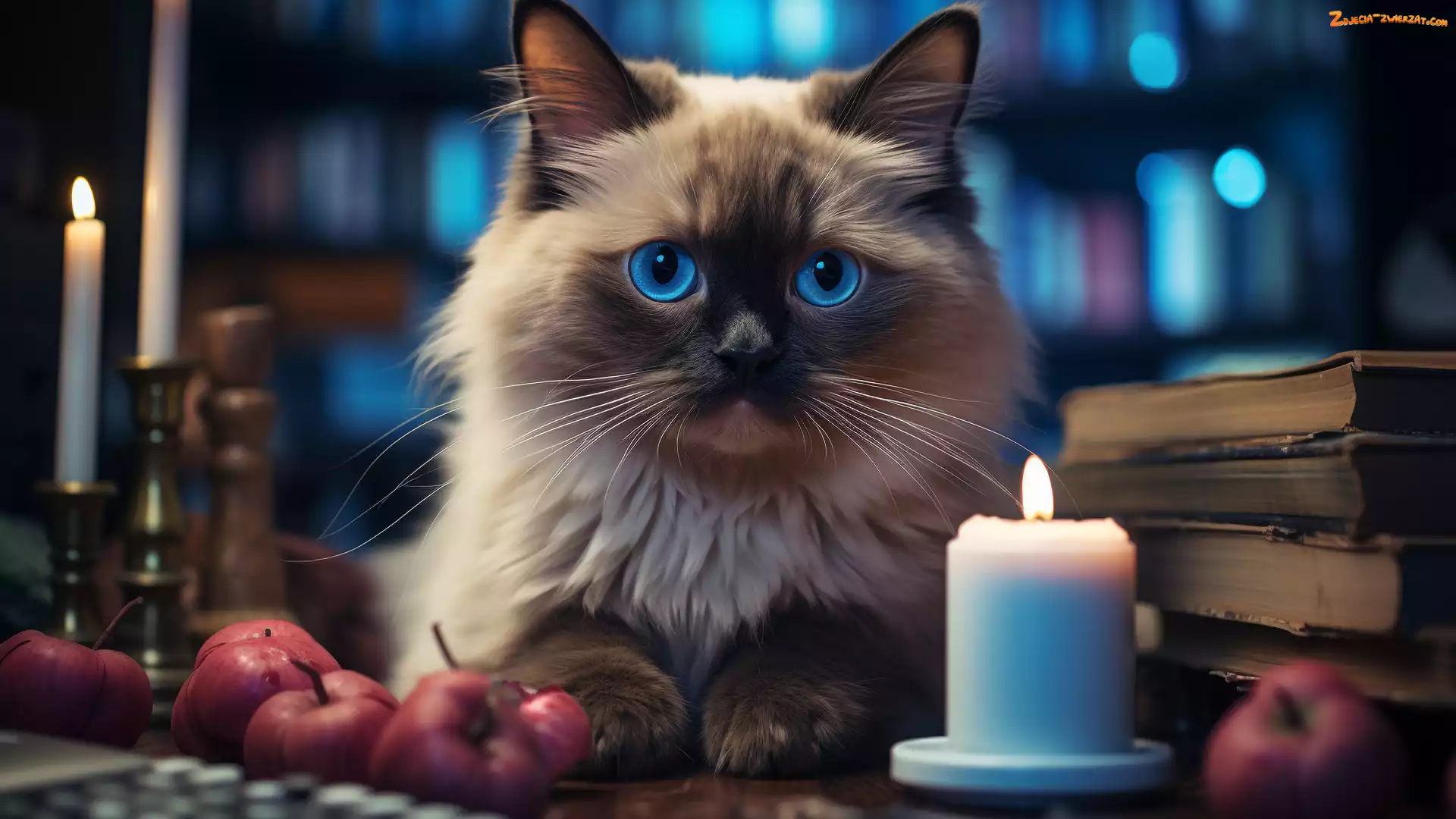 Zdjęcie: Świece, Długowłosy, Kot, Oczy, Książki, Niebieskie, Jabłka