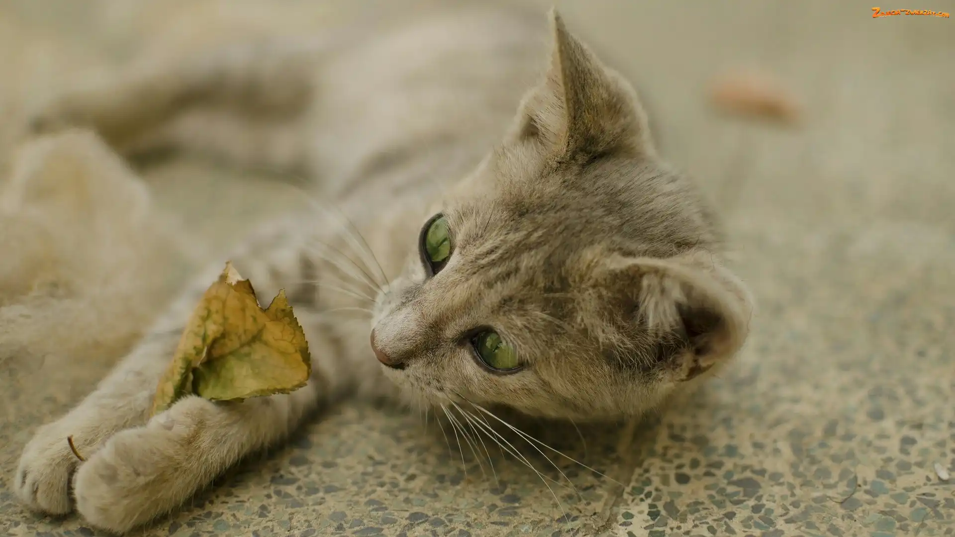 Zdjęcie: Tło, Oczy, Kotek, Liść, Rozmyte, Zielone, Jesienny