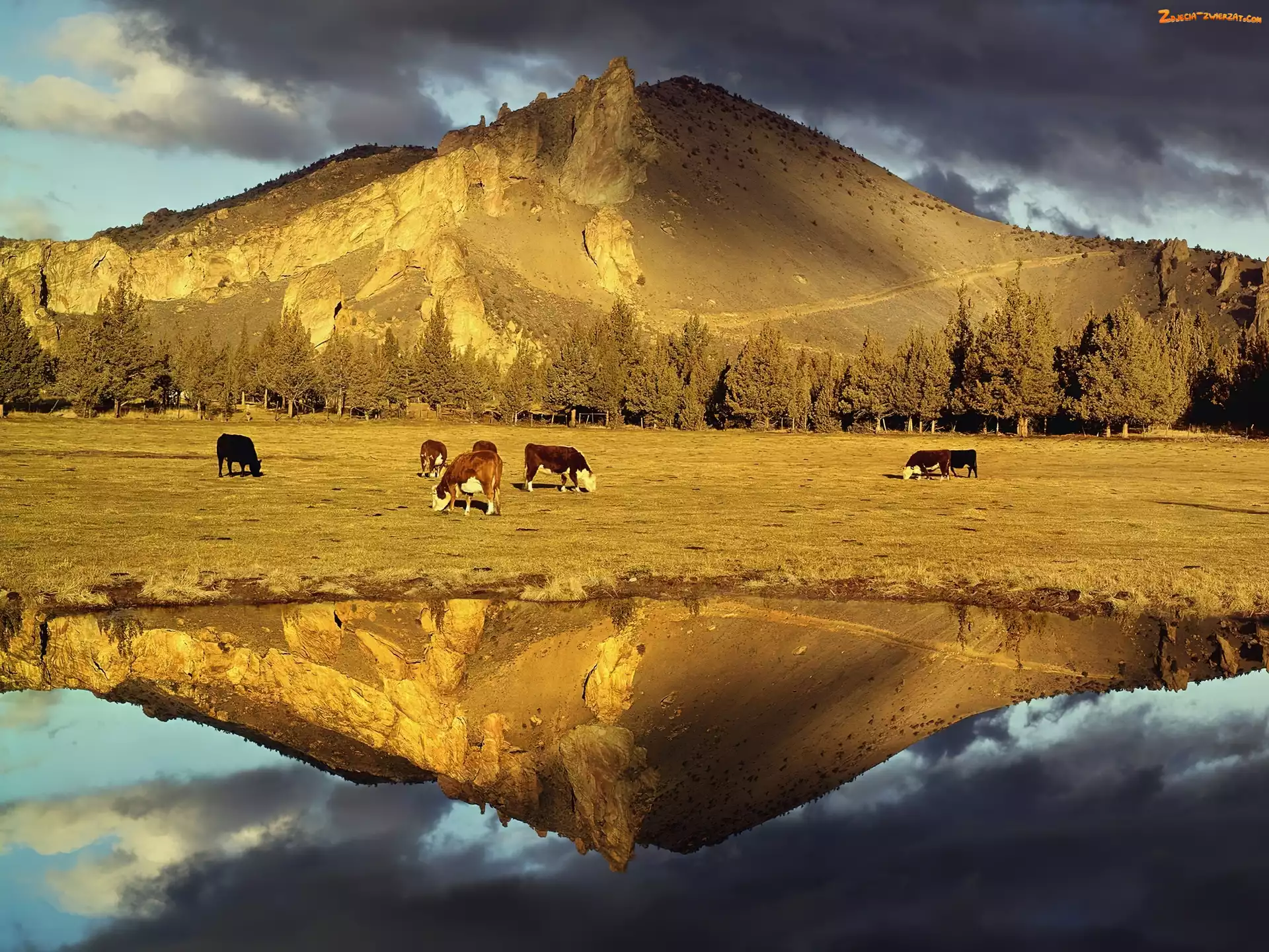 Odbicie, Woda, Pastwisko, Góra, Krowy