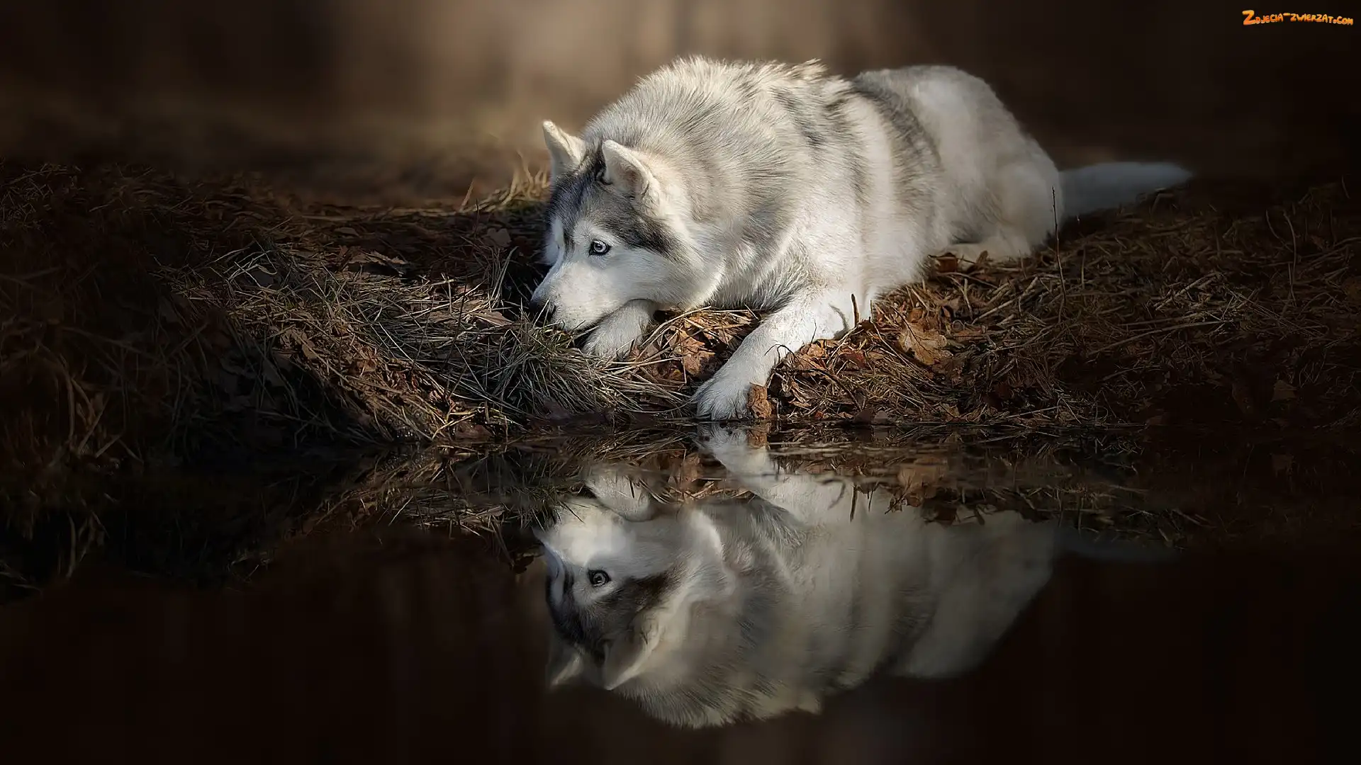 Zdjęcie: Odbicie, Woda, Leżący, Pies, Siberian husky