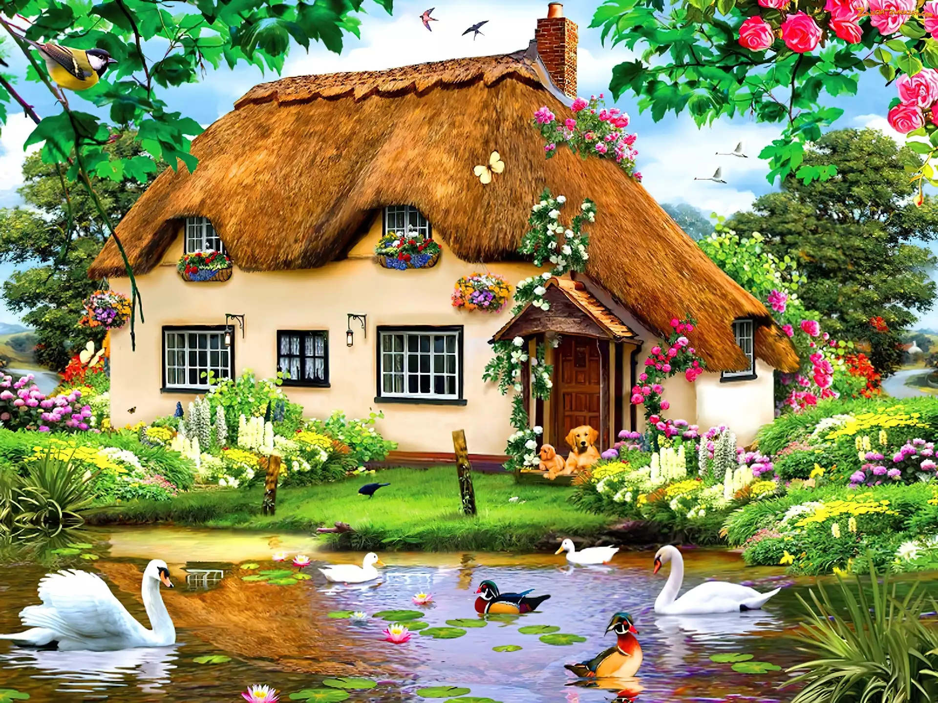 Zdjęcie: Ogród, Kaczki, Dom, Łabędzie
