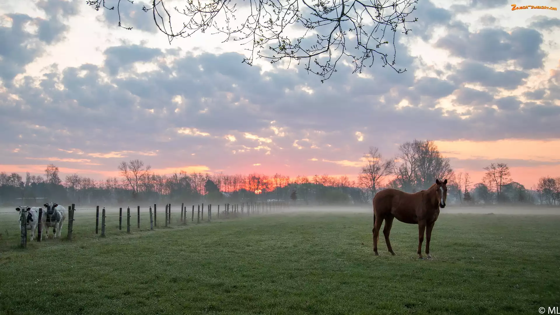 Zdjęcie: Mgła, Krowy, Wschód słońca, Łąka, Koń, Płot, Drzewa, Pole, Ogrodzenie