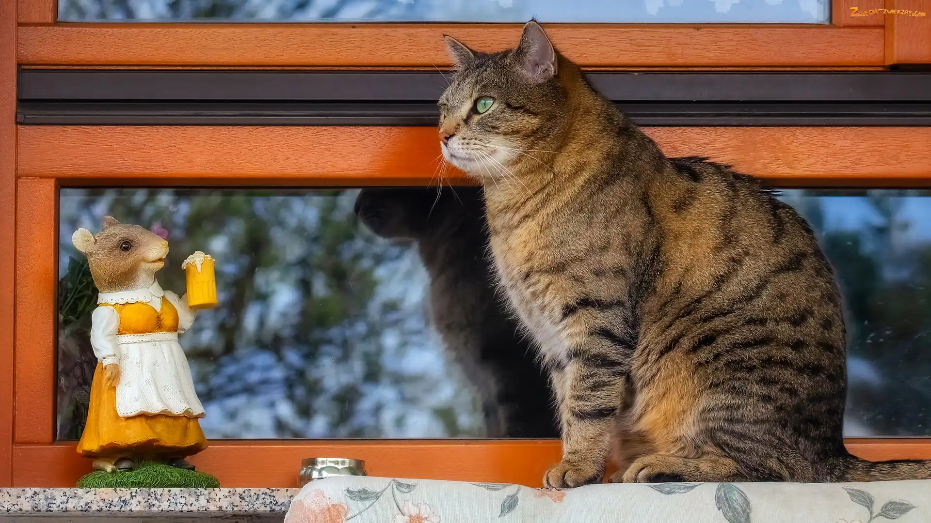 Okno, Bury, Mysz, Figurka, Kot, Parapet