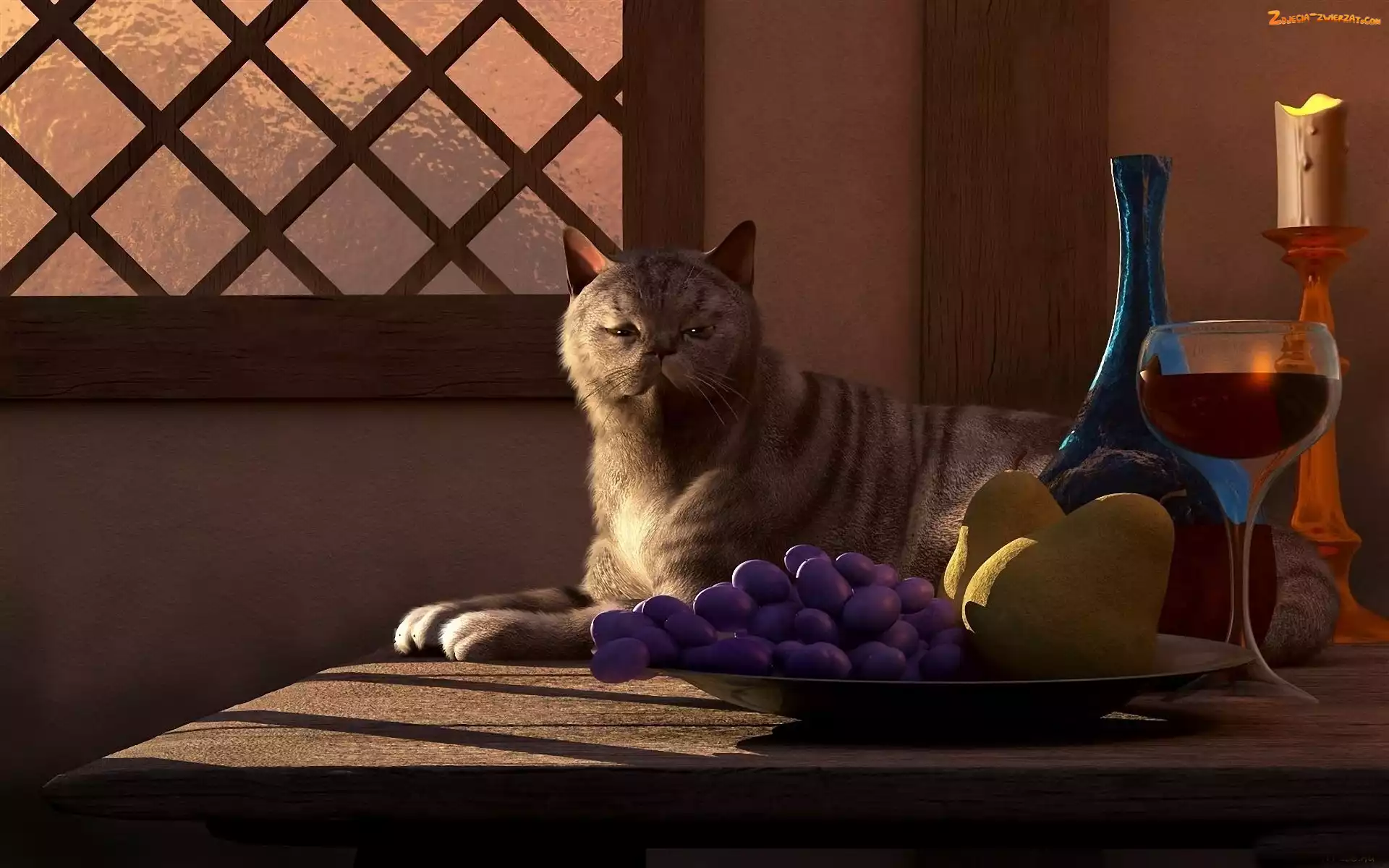 Zdjęcie: Okno, Winogrona, Kot, Wino
