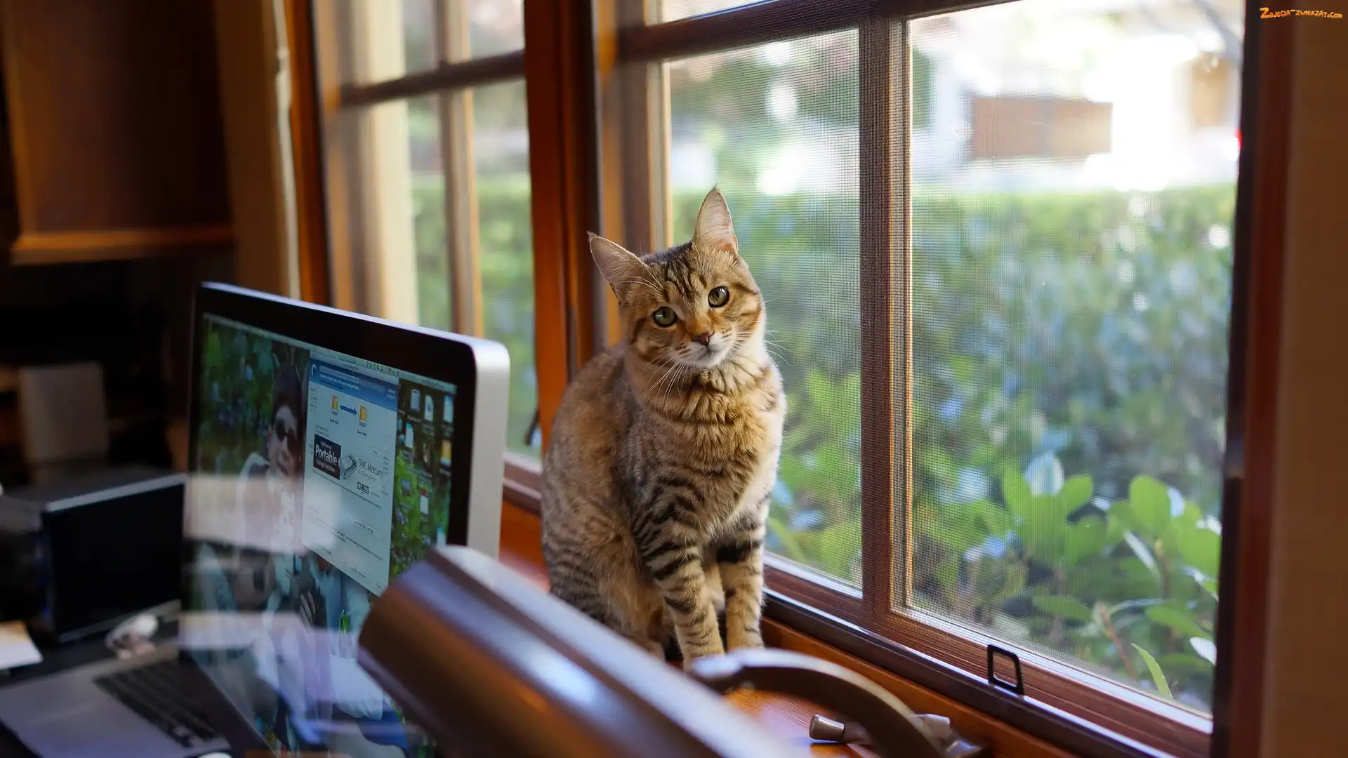 Zdjęcie: Okno, Laptop, Kotek, Biurko