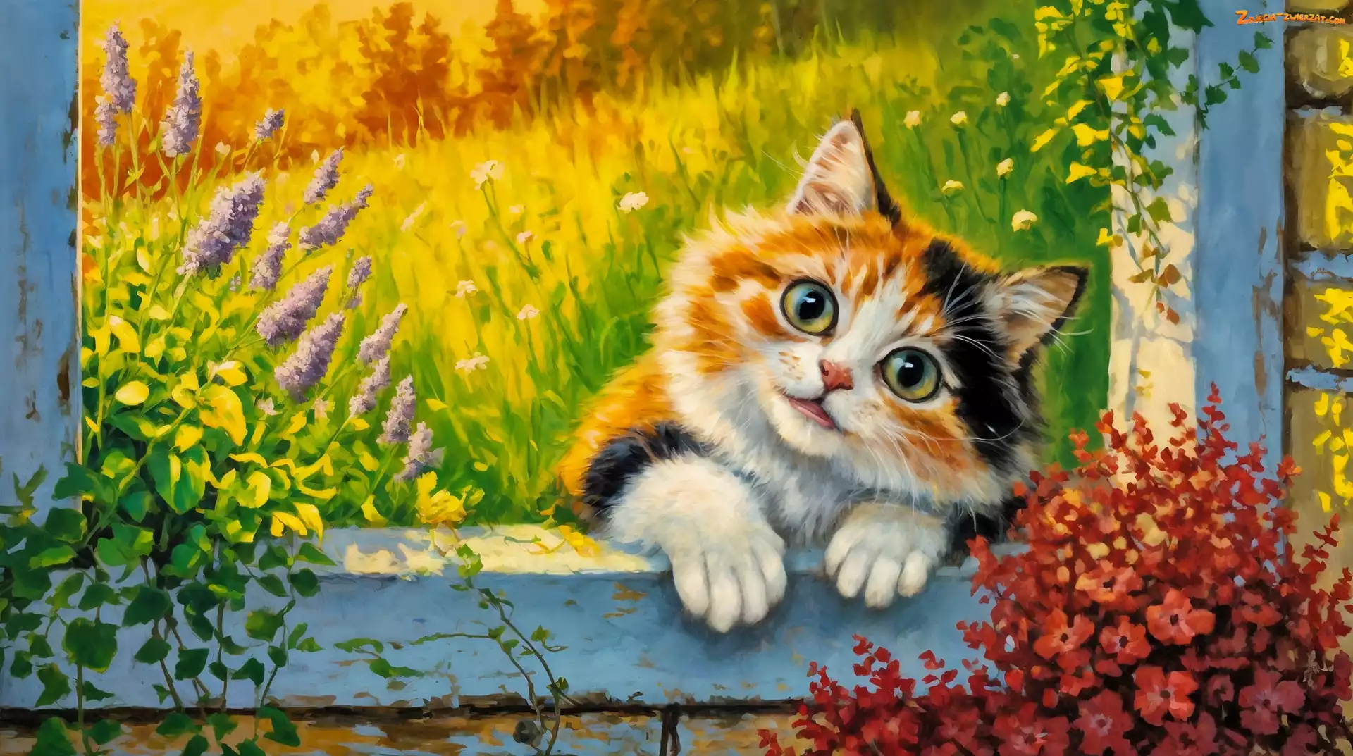 Zdjęcie: Grafika, Rama, Kot, Okno, Kwiaty, Łąka