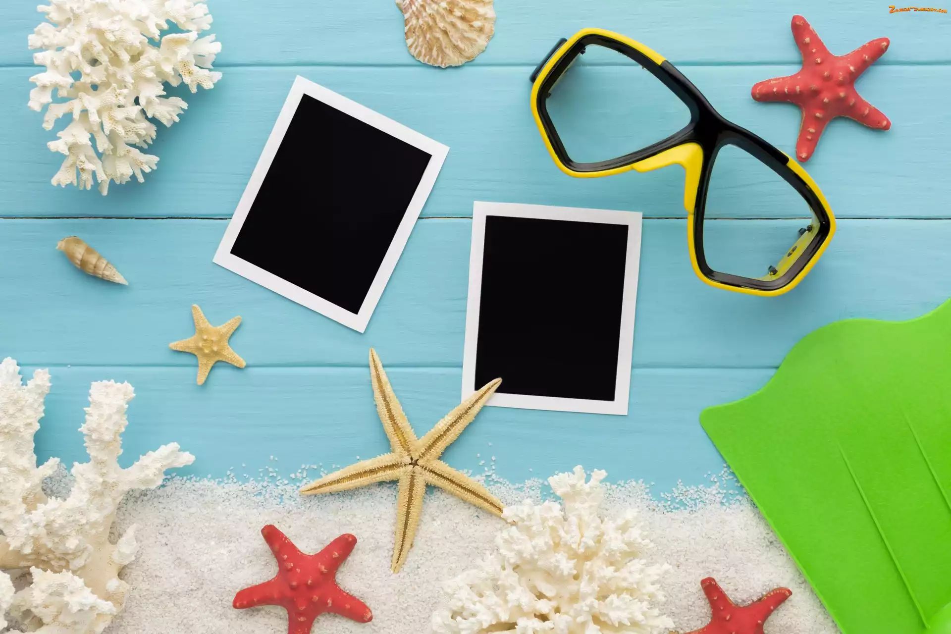 Koralowce, Okulary, Piasek, Kompozycja, Zdjęcia, Płetwy, Rozgwiazdy, Muszelki