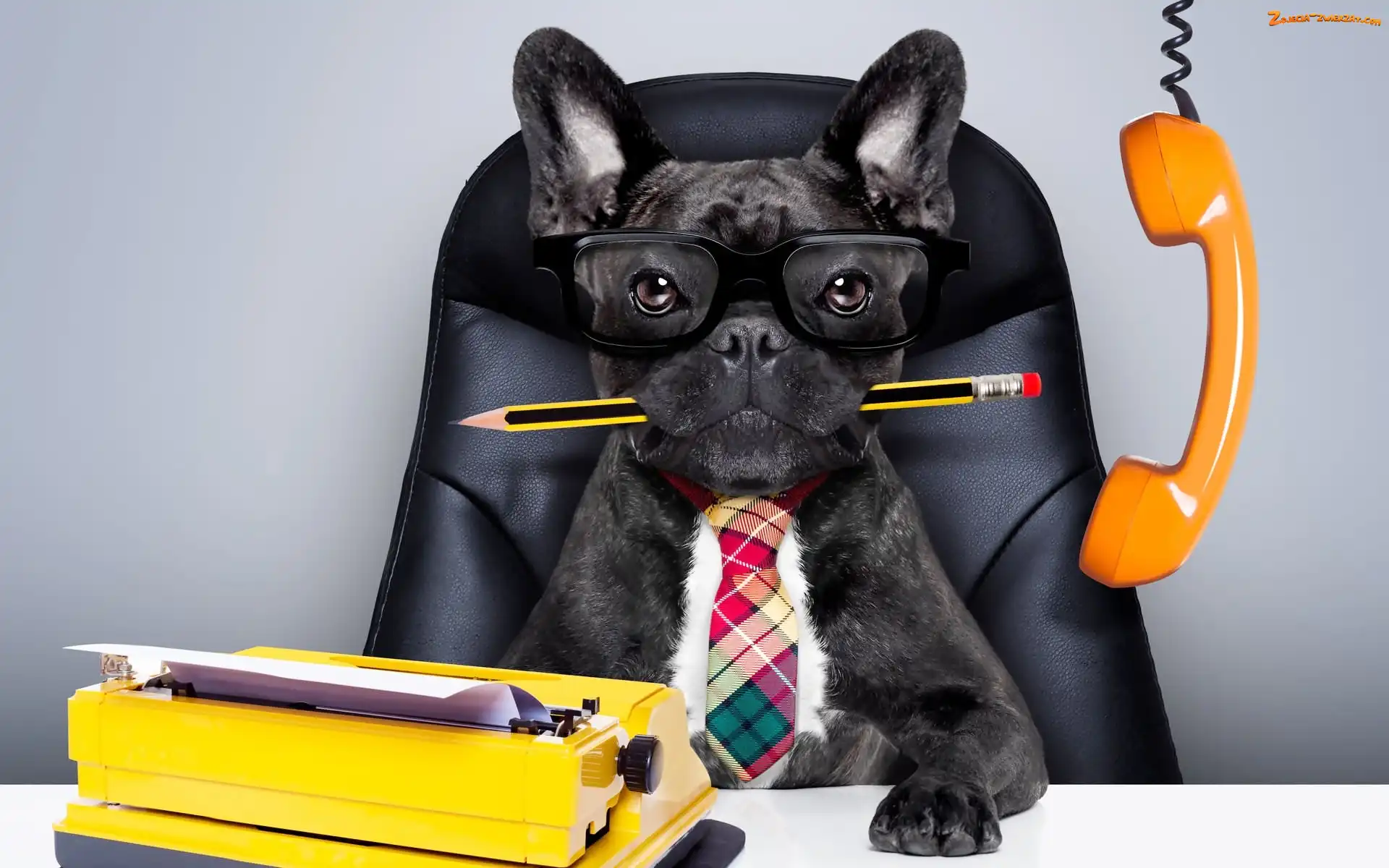 Zdjęcie: Maszyna do pisania, Buldog francuski, Śmieszne, Krawat, Telefon, Okulary