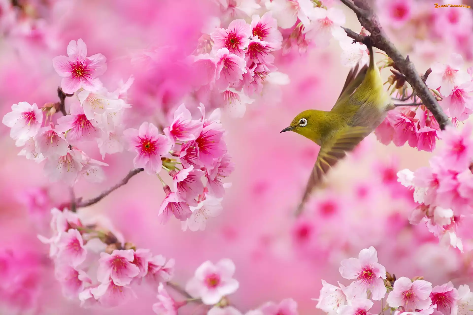 Zdjęcie: Okwiecone, Ptak, Kwiaty, Różowe, Szlarnik, Gałązki