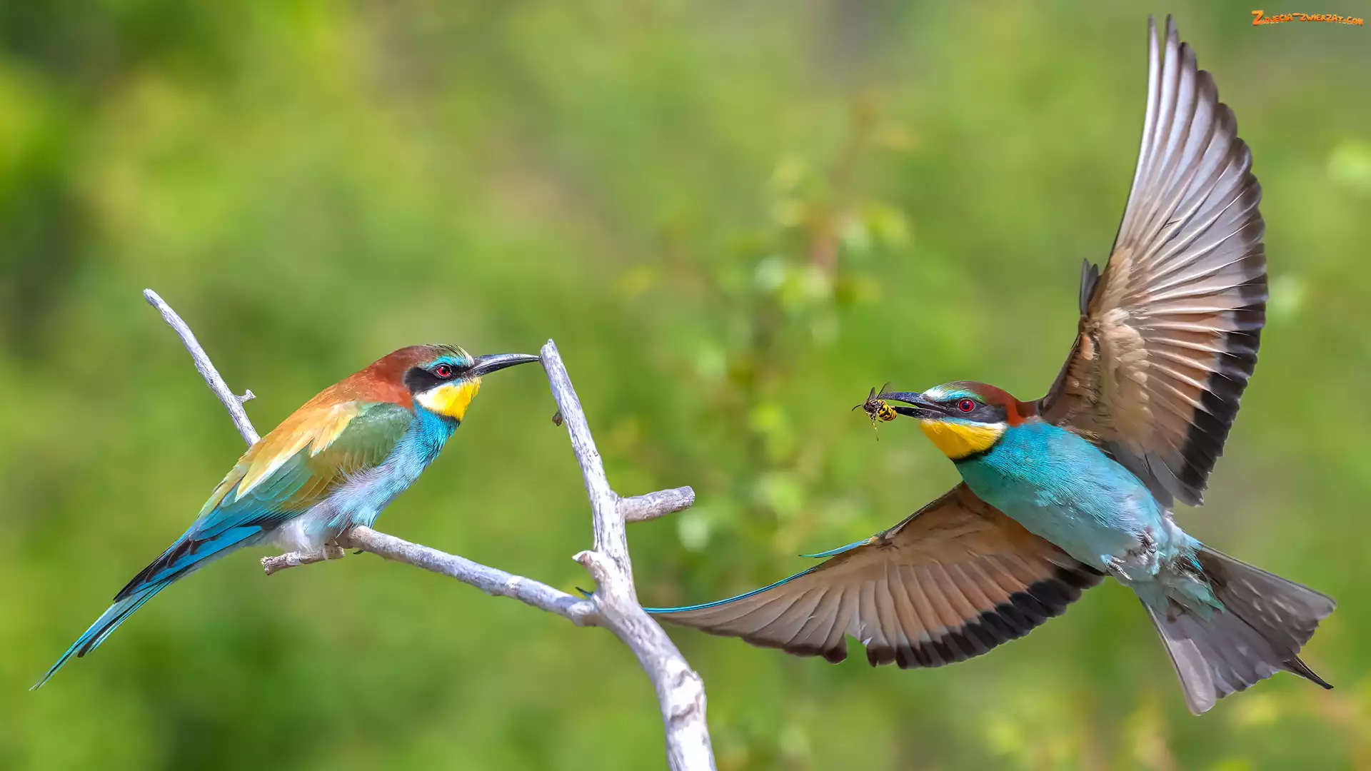 Zdjęcie: Żołny zwyczajne, Dwa, Gałązki, Skrzydła, Ptaki, Rozpostarte