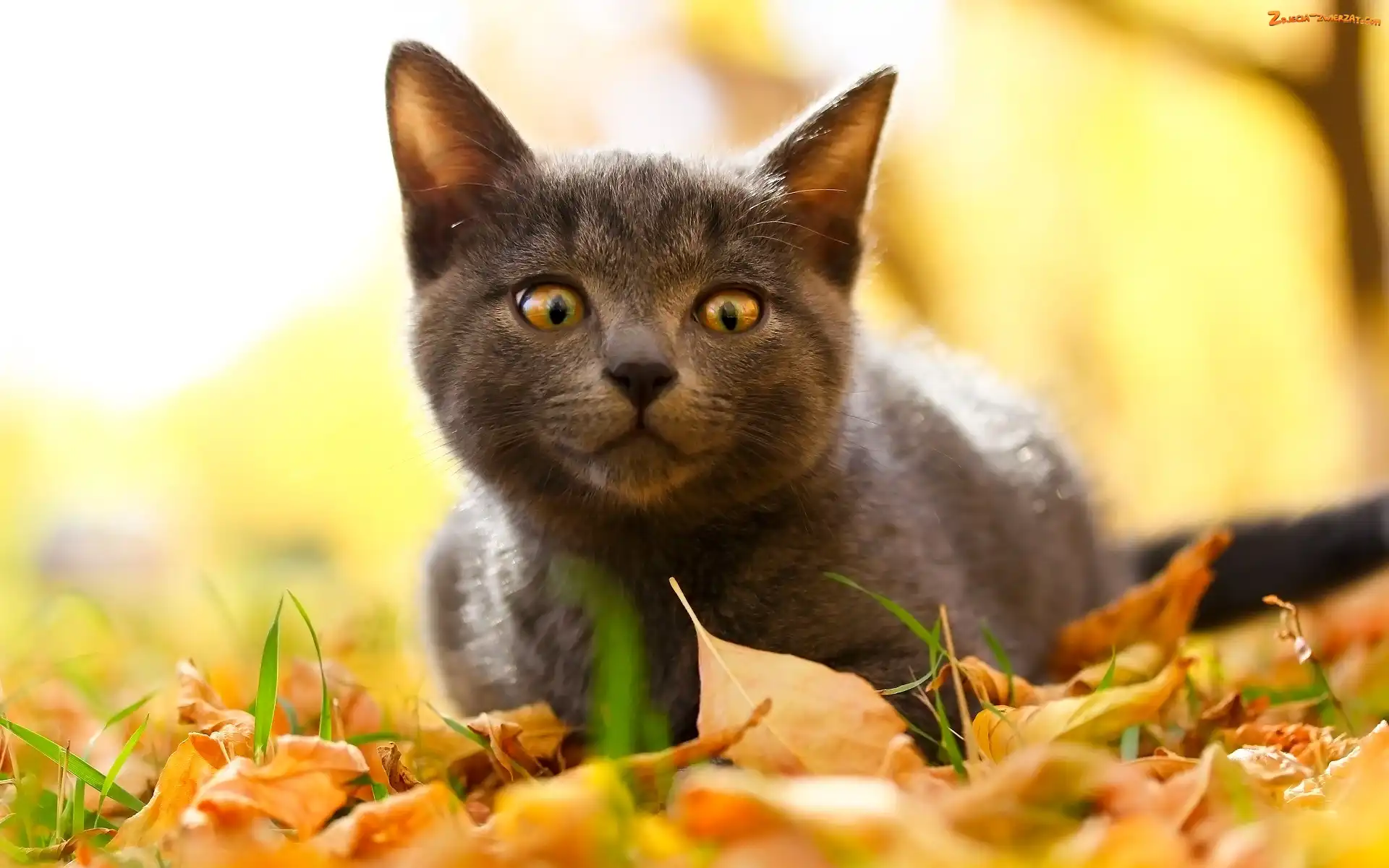 Zdjęcie: Żółte, Zapatrzony, Jesień, Liście, Kot, Oczy