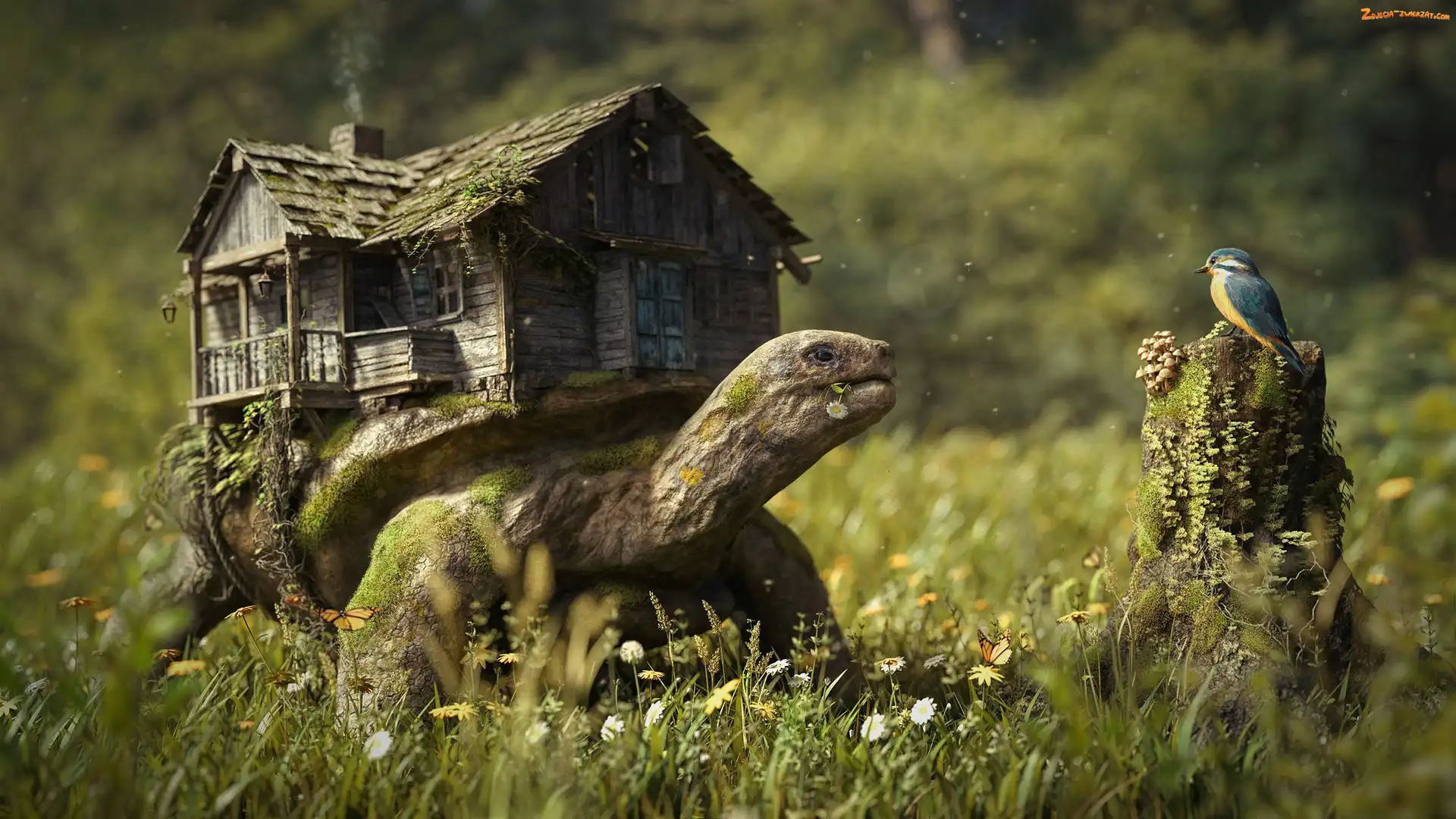 Zdjęcie: Pniak, Żółw, Mech, Trawa, Domek, Ptak. Kwiaty