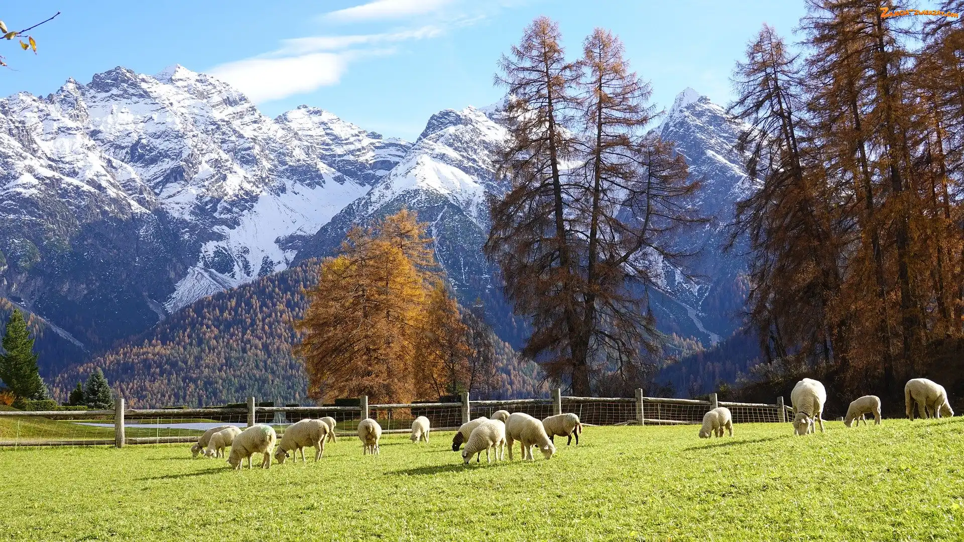 Pastwisko, Ośnieżone, Jesień, Drzewa, Owce, Góry, Szczyty