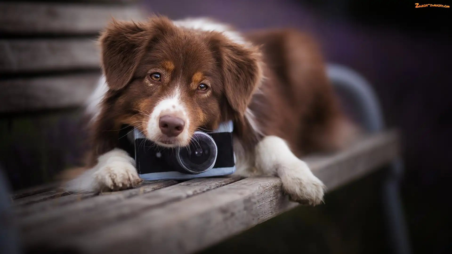 Zdjęcie: Owczarek australijski, Ławka, Pies, Aparat fotograficzny