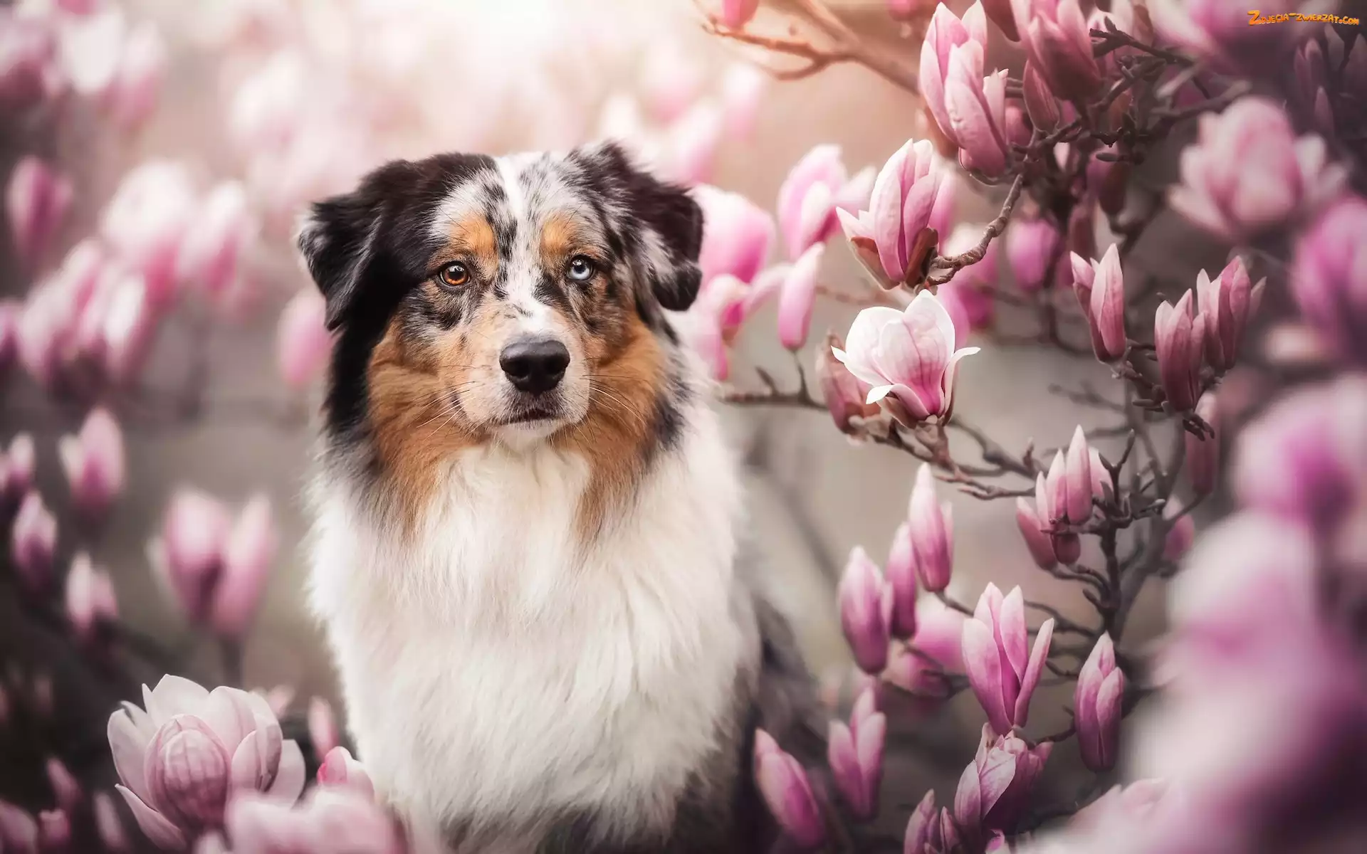 Zdjęcie: Pies, Owczarek australijski, Magnolia, Kwiaty