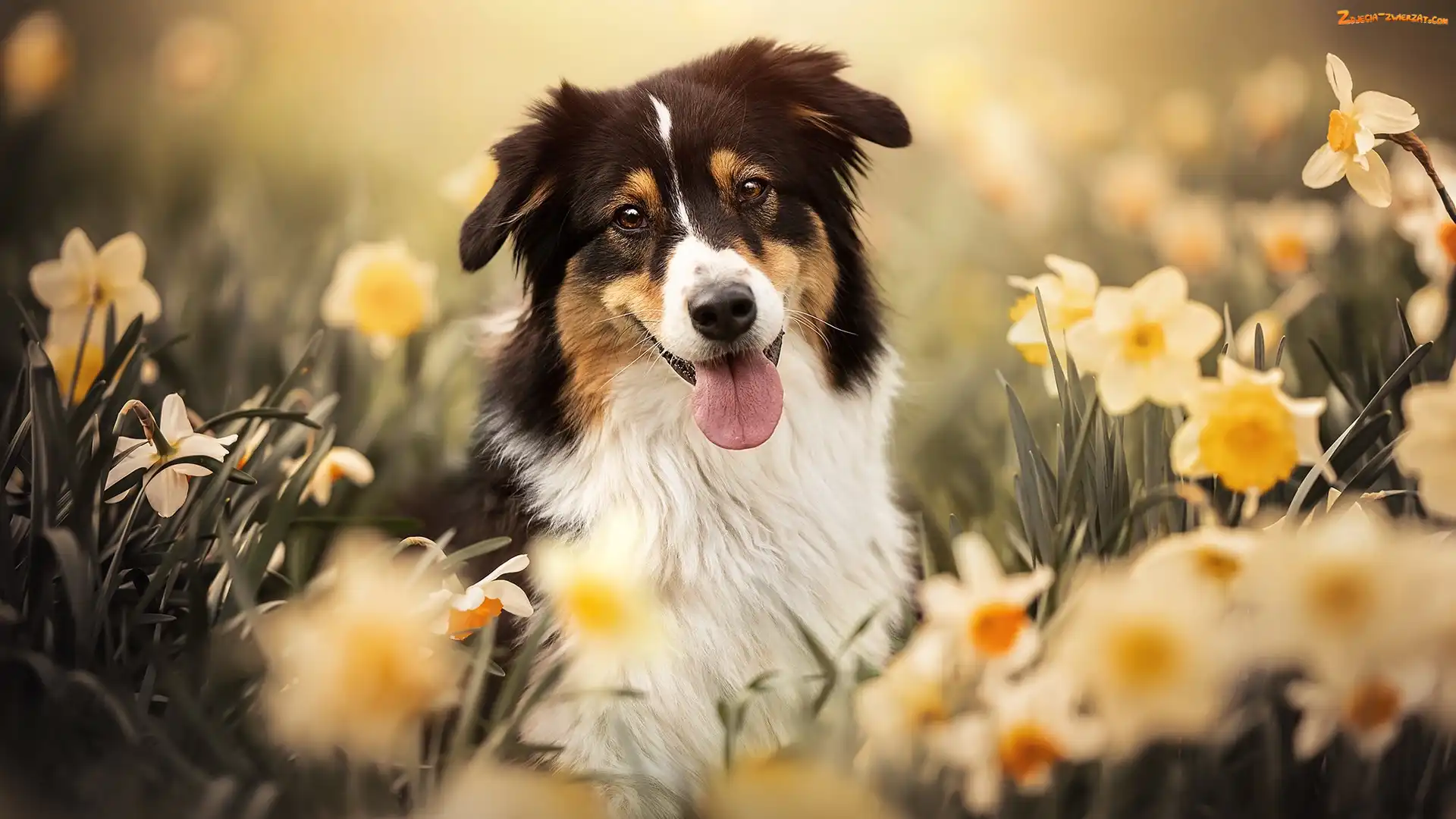 Zdjęcie: Pies, Owczarek australijski, Narcyzy, Kwiaty