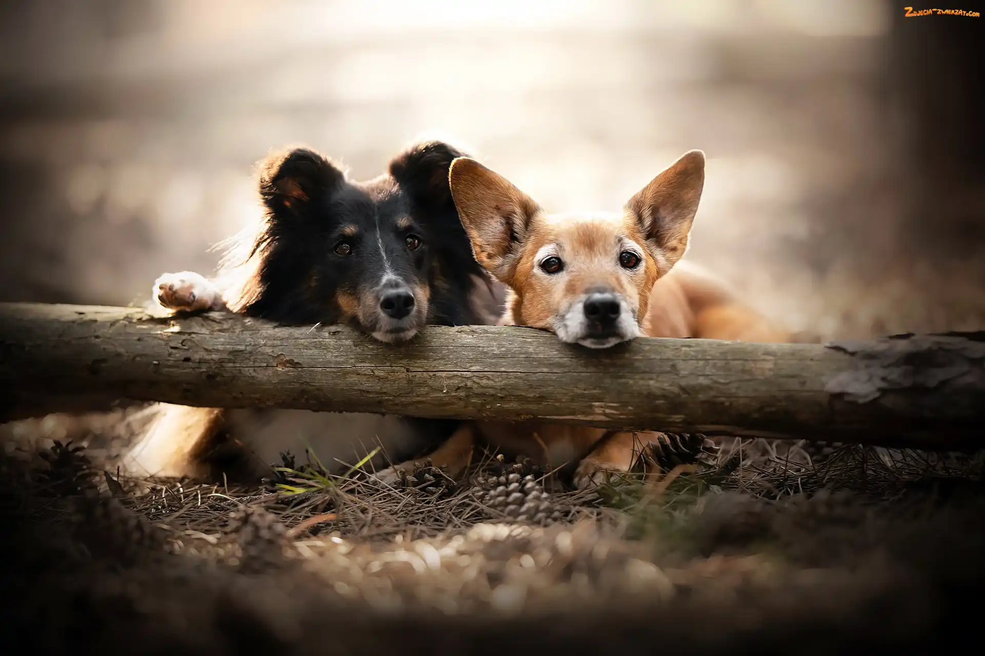 Zdjęcie: Szyszki, Owczarek szetlandzki, Dwa, Kłoda, Drzewa, Psy, Kundelek