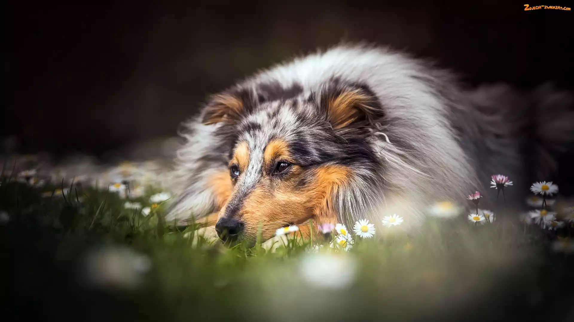 Zdjęcie: Owczarek szkocki długowłosy, Kwiaty, Leżący, Łąka