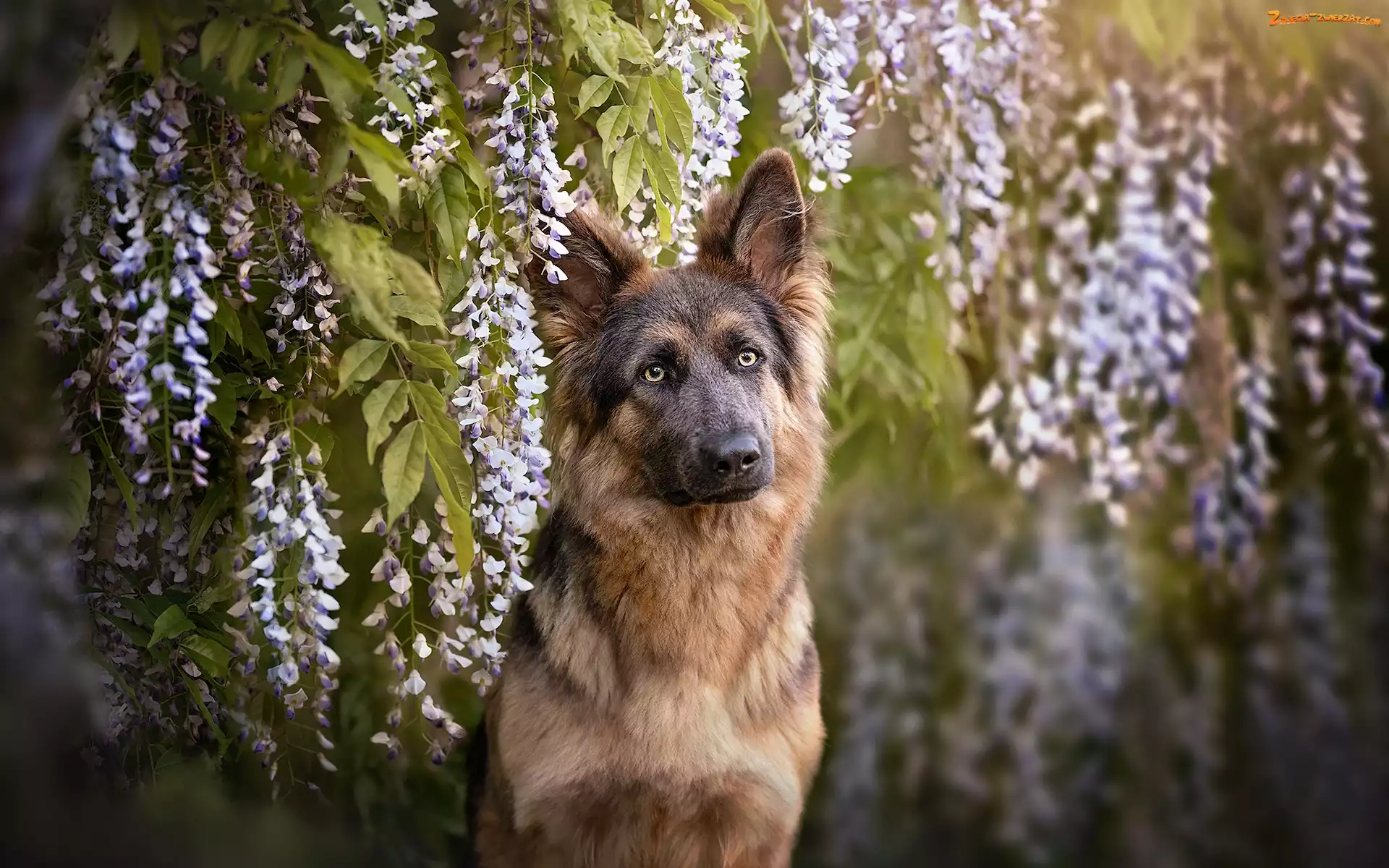 Zdjęcie: Pies, Owczarek niemiecki, Glicynia, Kwiaty
