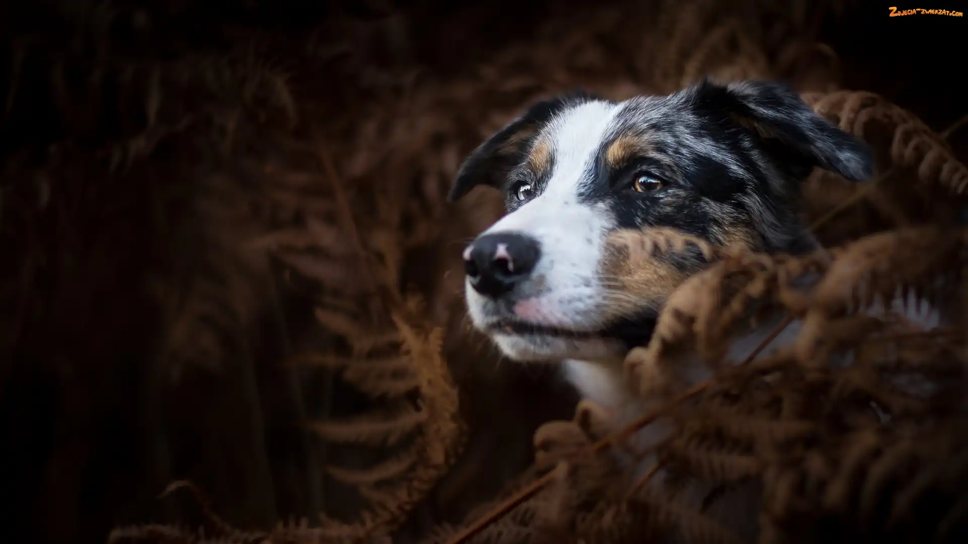 Zdjęcie: Pies, Owczarek australijski, Ciemne tło, Paprocie