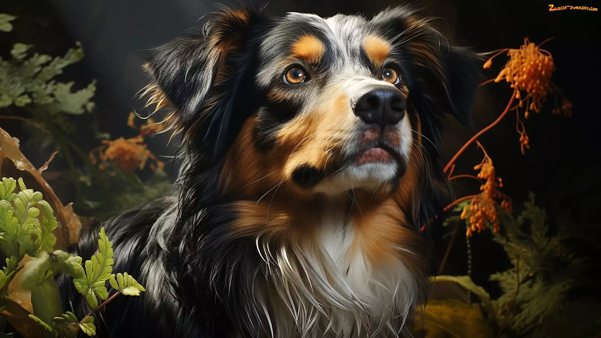 Zdjęcie: Grafika, Spojrzenie, Pies, Owczarek australijski, Trawa, Rośliny