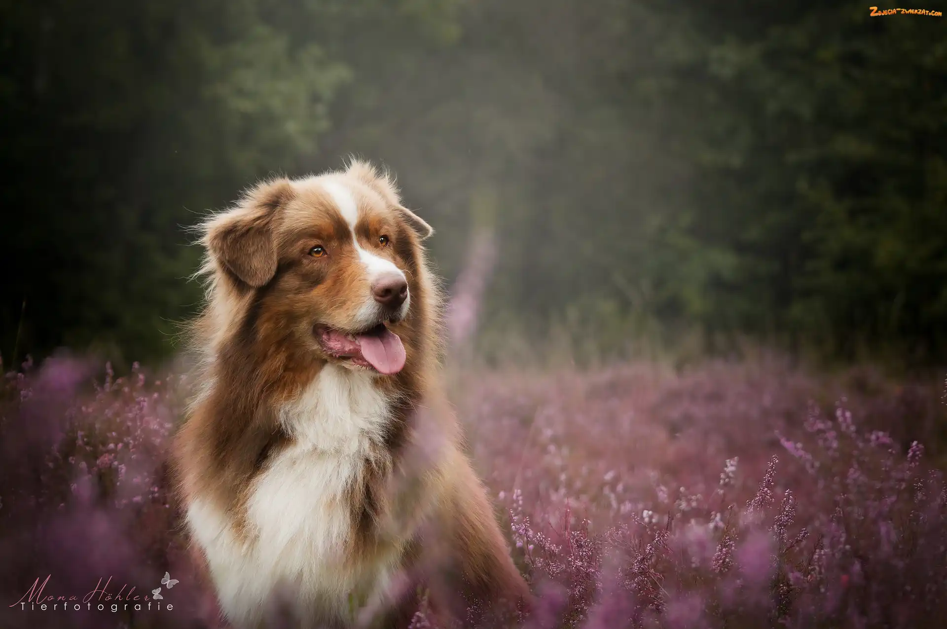 Zdjęcie: Owczarek australijski, Wrzos, Pies, Łąka