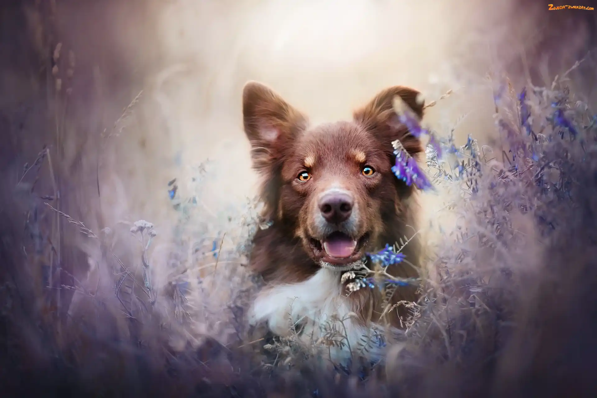 Zdjęcie: Owczarek australijski, Wyka, Pies, Kwiaty